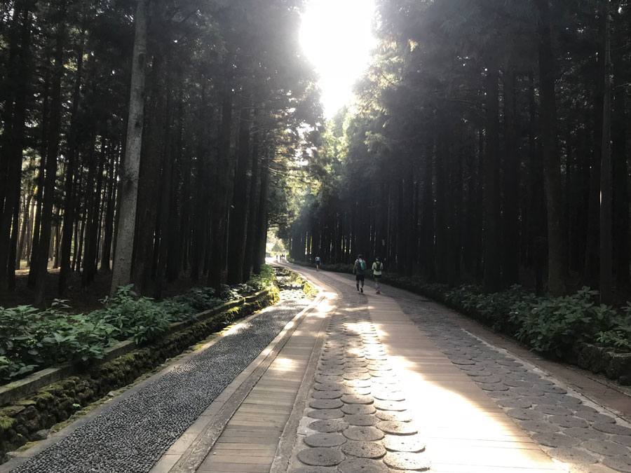 ようやく森を抜けて、行きも通ったJeju National Universityのロードへ。しかし、なぜかロードのマーキングが少ない!道が広いこともあって、交差点の度に止まって確認する。それでも不安なので、後ろにいた地元ランナーに先行してもらって、後についていく作戦。