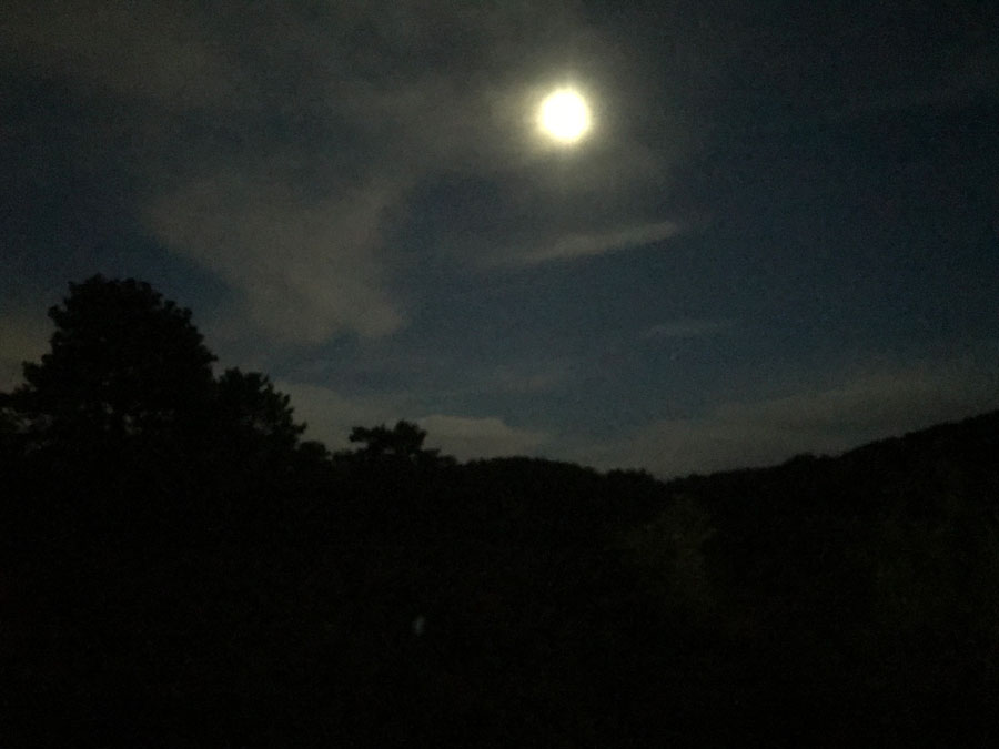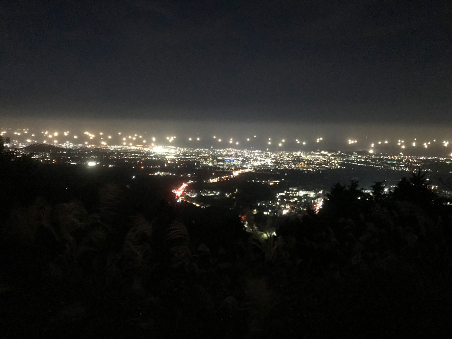 完全に陽が暮れる。森の最後に200mほど丘に登るのだが、ここから見える月と島の夜景が本当に綺麗だった。