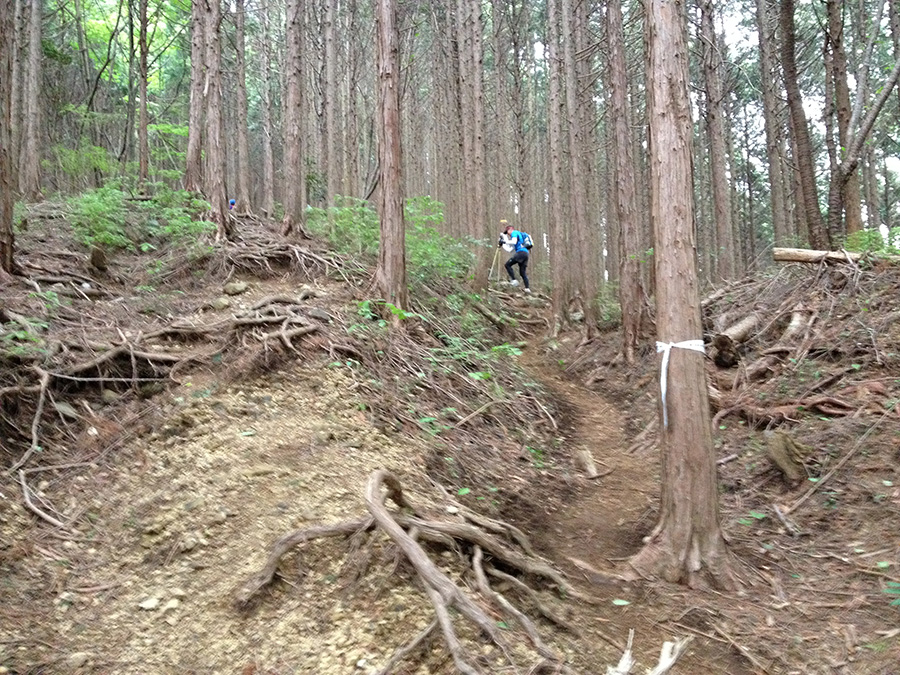 試走したランナーのみならず、主催者側である鏑木さんも「難関」と公言する天子山地。1300mくらいまでは一気に登りが続くが、そこから1300m〜1600m付近を登ったり降りたりを繰り返す。ここで精神と体力を消耗されるのだろう。
