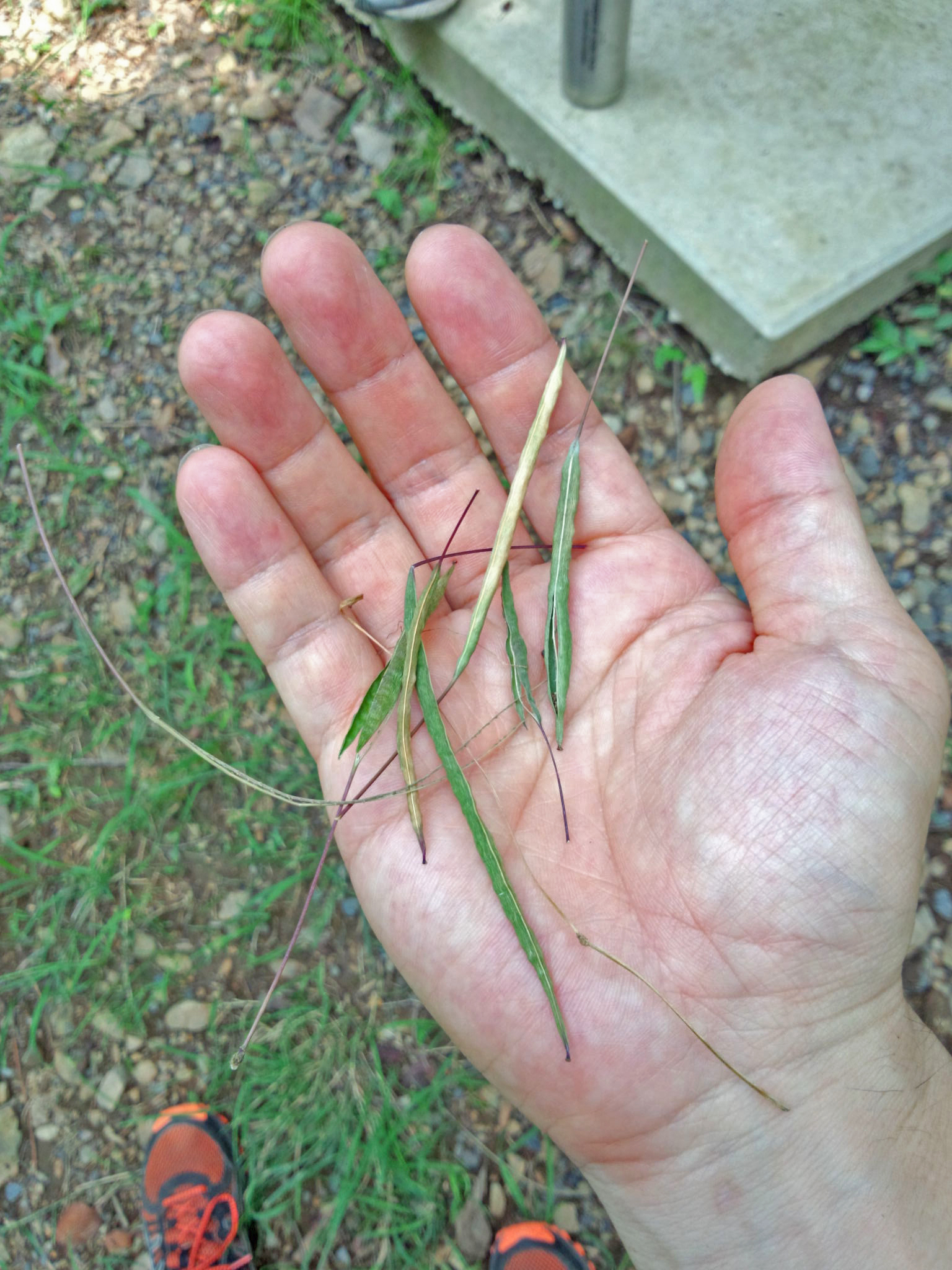 偶々この東屋で出会った地元のトレイルランナーのお二人は、毎回このコースに来る度に、お花が咲く山の植物の種を持参してこの頂上付近に蒔いていらっしゃるということで、私も急遽そのお手伝いをすることに。