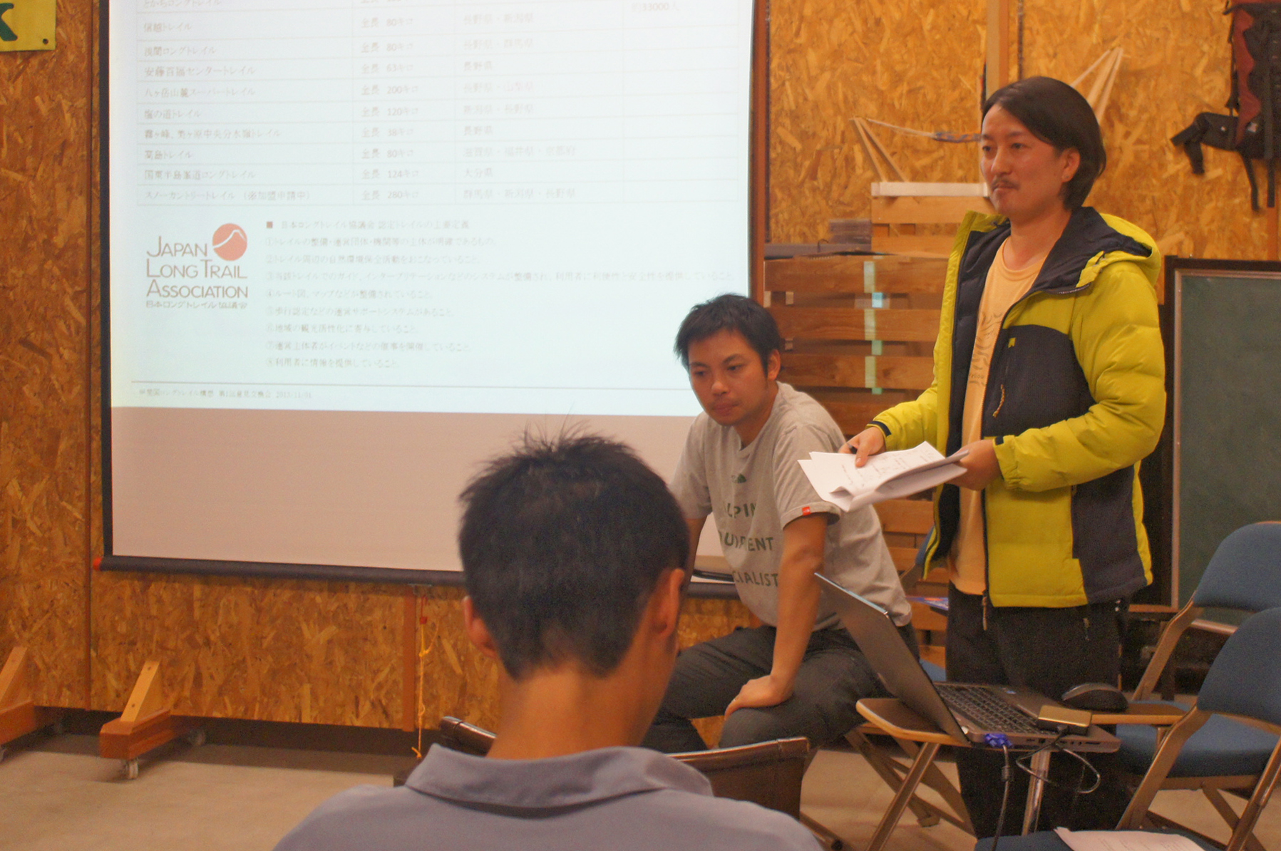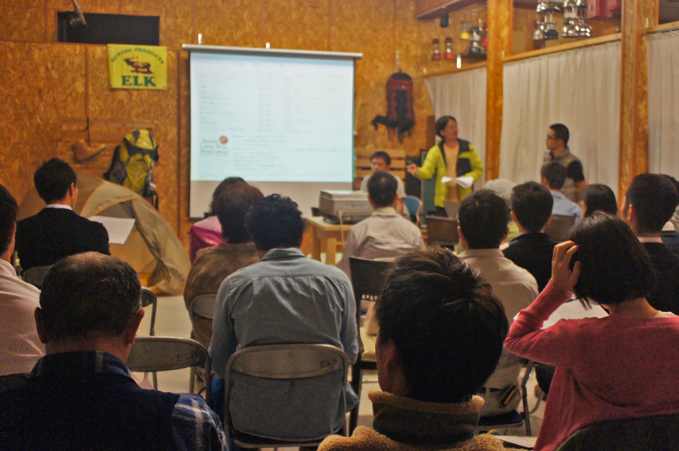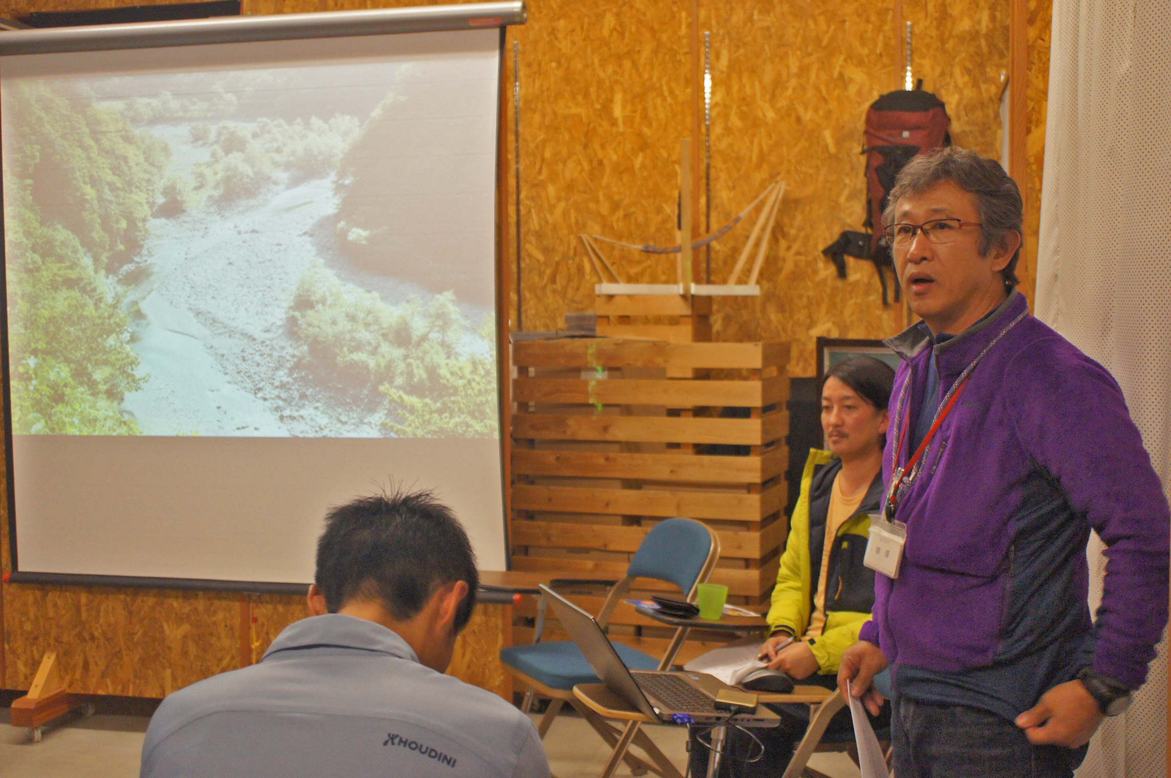 意見交換会の前半は、平賀、一瀬からの概要説明やこれまでの活動報告、今後本格的に実行メンバーとして加わって頂くデザイナーの嶋津さん、そしてトレイルランナーであり高校教員の山本健一さん、最後にこの山梨にて長くアウトドアショップを経営されているELK社長の柳澤さんより、このプロジェクトに対する可能性をお話頂きました。