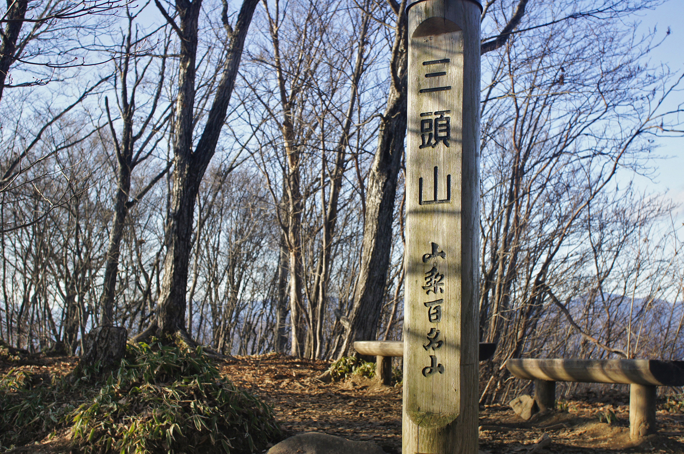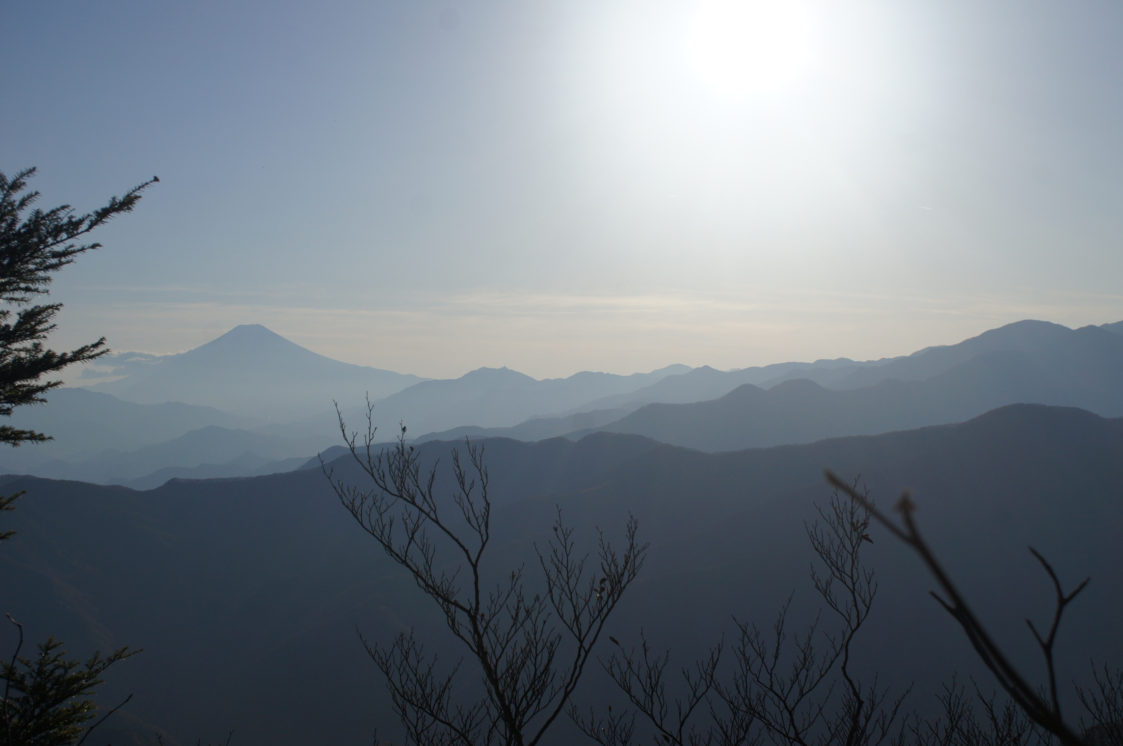 また三頭山は、東京都の奥多摩町・檜原村、そして山梨県の上野原市・小菅村にまたがっていて、西峰山頂には東京都の道標の他に「鶴峠」の方向に歩き始めるとすぐに山梨百名山の山頂標[写真下]があり、左手を見れば、手前に広がる稜線のレイヤーが神秘的な富士山ビュー[写真上]を望むことができます。また鶴峠に向かう神楽入ノ峰方向の稜線のルートでも、富士山や大菩薩嶺の南東側からつながる尾根のシルエット[写真下]を木々の間から望むことができました。