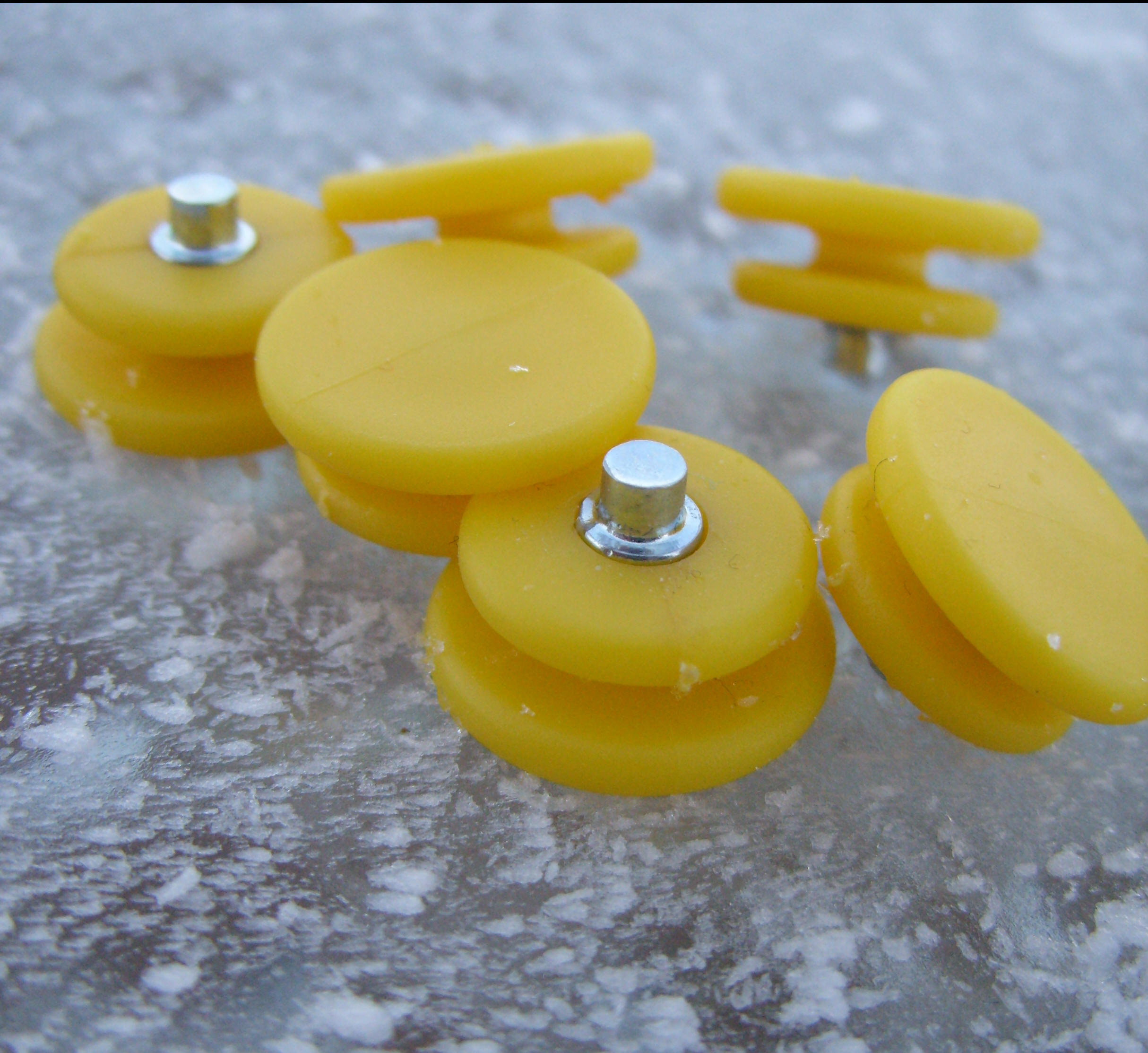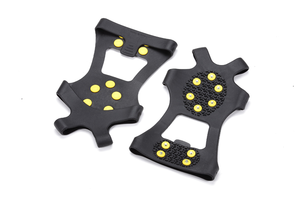 熱可塑性エラストマ:Thermoplastic Elastomer(TPE)のベースに、金属チップが埋め込まれた黄色いスタッドが取り付けられており、摩耗すれば取り替えられる構造になっています。シューズへの取付けは非常に簡単で、片側をつま先に入れた後、もう片側についているベロ部を引っ張って踵に引っ掛ければセッティング完了。細かな操作が無いため、装着・取り外し操作は、寒くて手がかじかんでいても、また防寒用グローブをつけたままでも行うことができるかと思います。