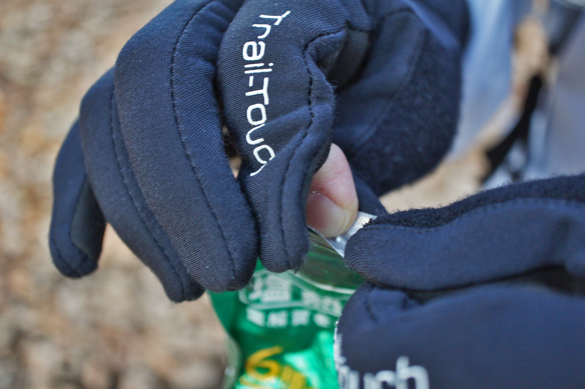 また、実際の現場では、上写真のように塩熱サプリやジップロックなどのチャックの開け閉め、ジェルなどの袋の開封、シューズの紐の締め付けや縛り等々をはじめ、人さし指だけでも出ているとより簡単に行えることが以外と多い(撮影の場合は、SDカードの取り出しやバッテリー交換なども)な、と感じることがよくあります。