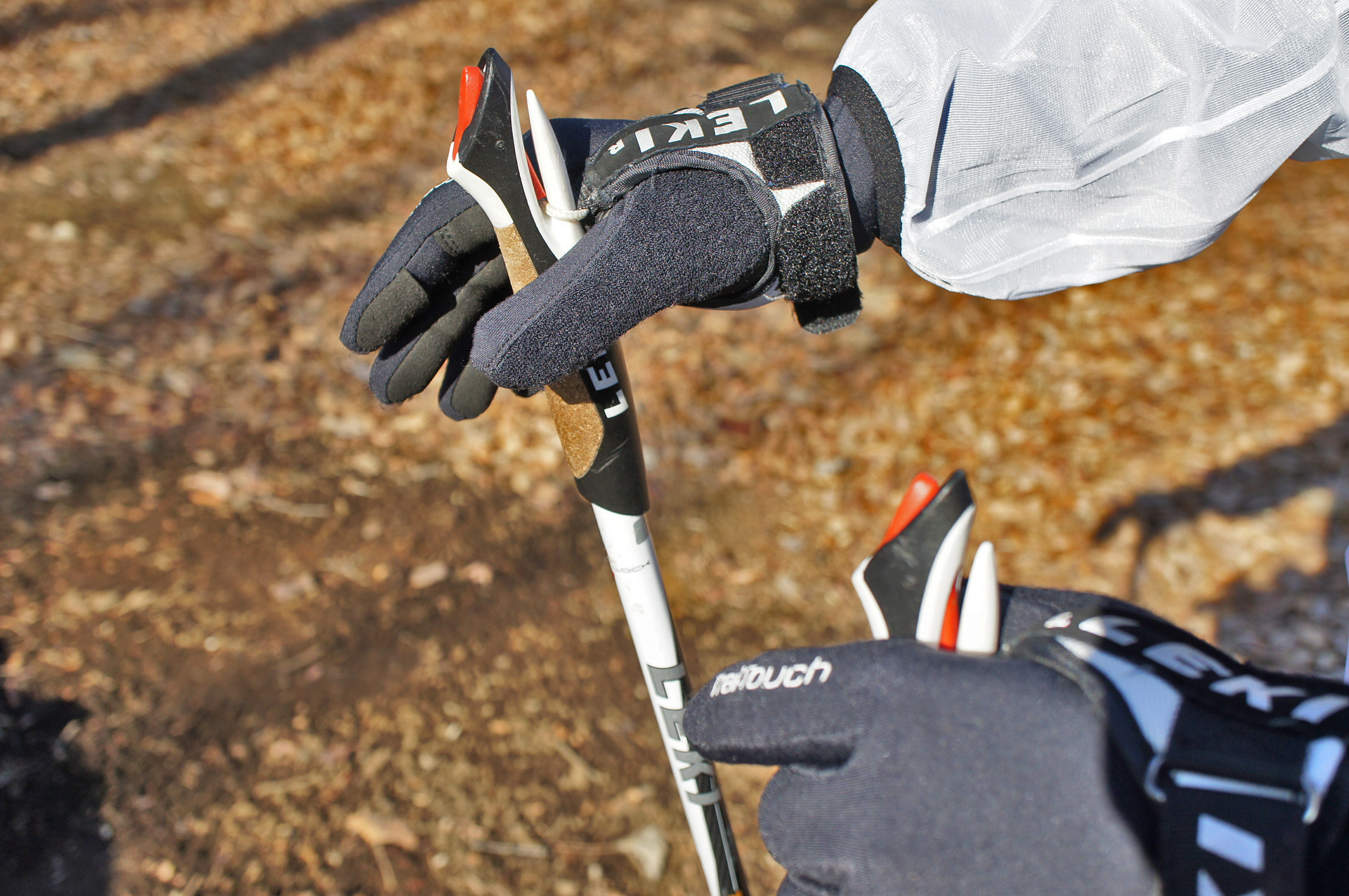 白い矢印マーク(RaidLightロゴ)部分は、ラバー状のプリントが施されており、ポールを握った時のグリップ性を高めている。(手首に巻かれているのはノルディックポール用のストラップ ※付属品ではありません)