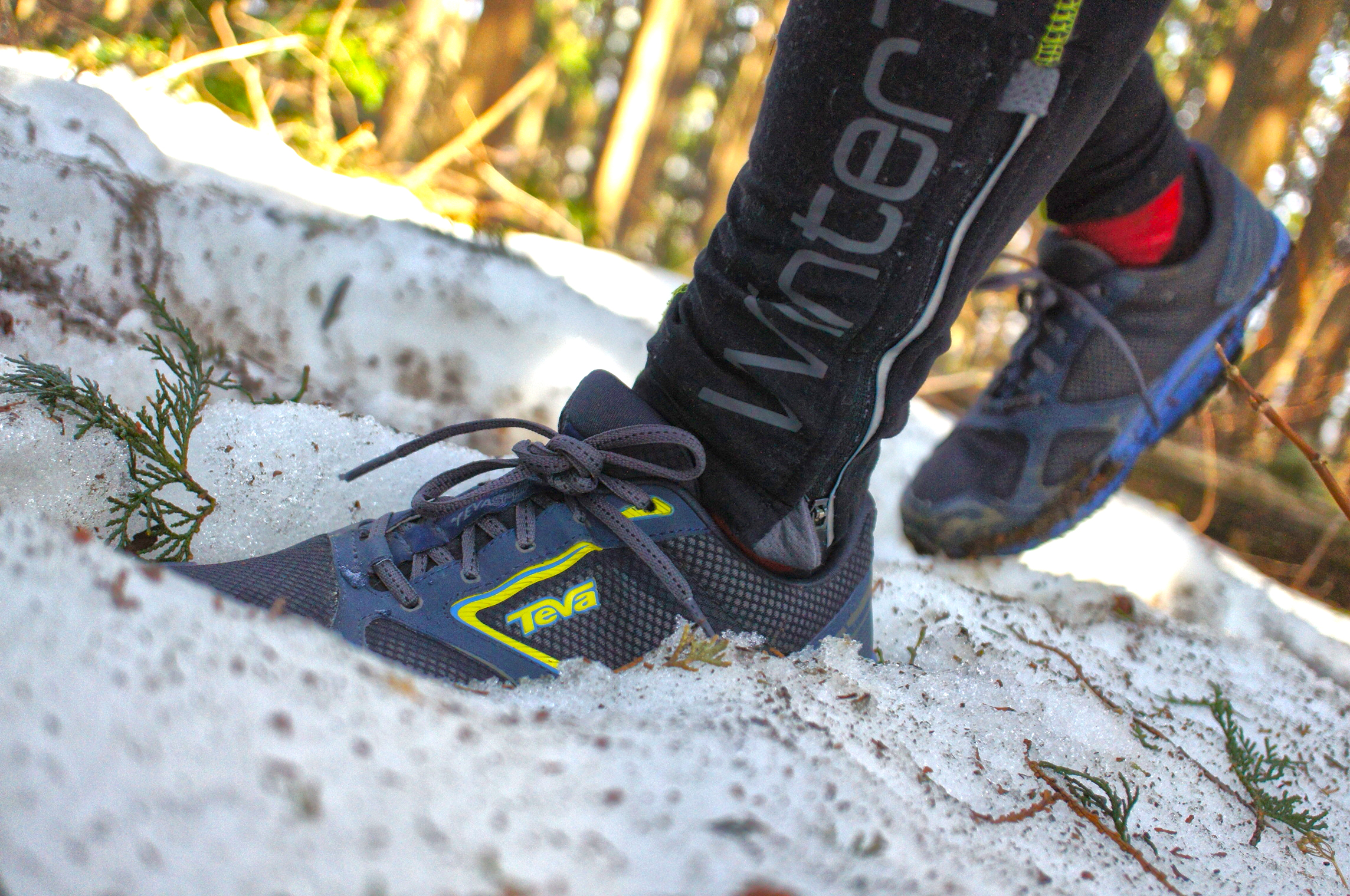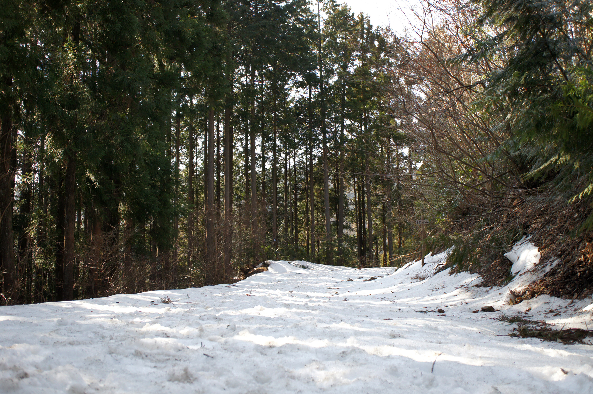 そして、雪がルート全体に広がっているのは、この後の「なちゃぎり林道とトレイルの合流点」から。雪が無ければ砂利道になっている林道ですが、下写真のように地面は全く見えない状態です。走るとある程度沈みましたが、雪上を歩く分にはトップの写真のような感じで、足もさほど濡れること無く進むことができました。