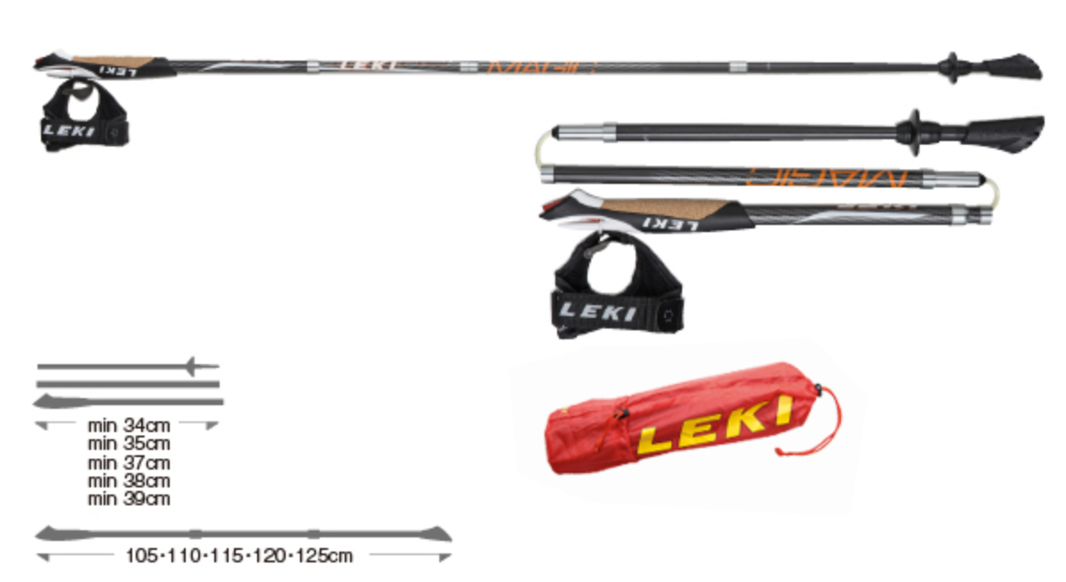 以前はコンパクトに収納できるLEKIのシリーズといえば、「トラベラーカーボン」や「スマートトラベラー」であったのですが、それらは伸縮式の構造で短くしても65cmほどはあり、使わない時の収納性(トレイルランニングでは、ザックに取付けたり・・)に優れているとは言えませんでしたが、NWマイクロマジックは折りたたみ時に35cm前後(使用するポールの長さにより34cm-39cm)となり、約半分の長さになりました。