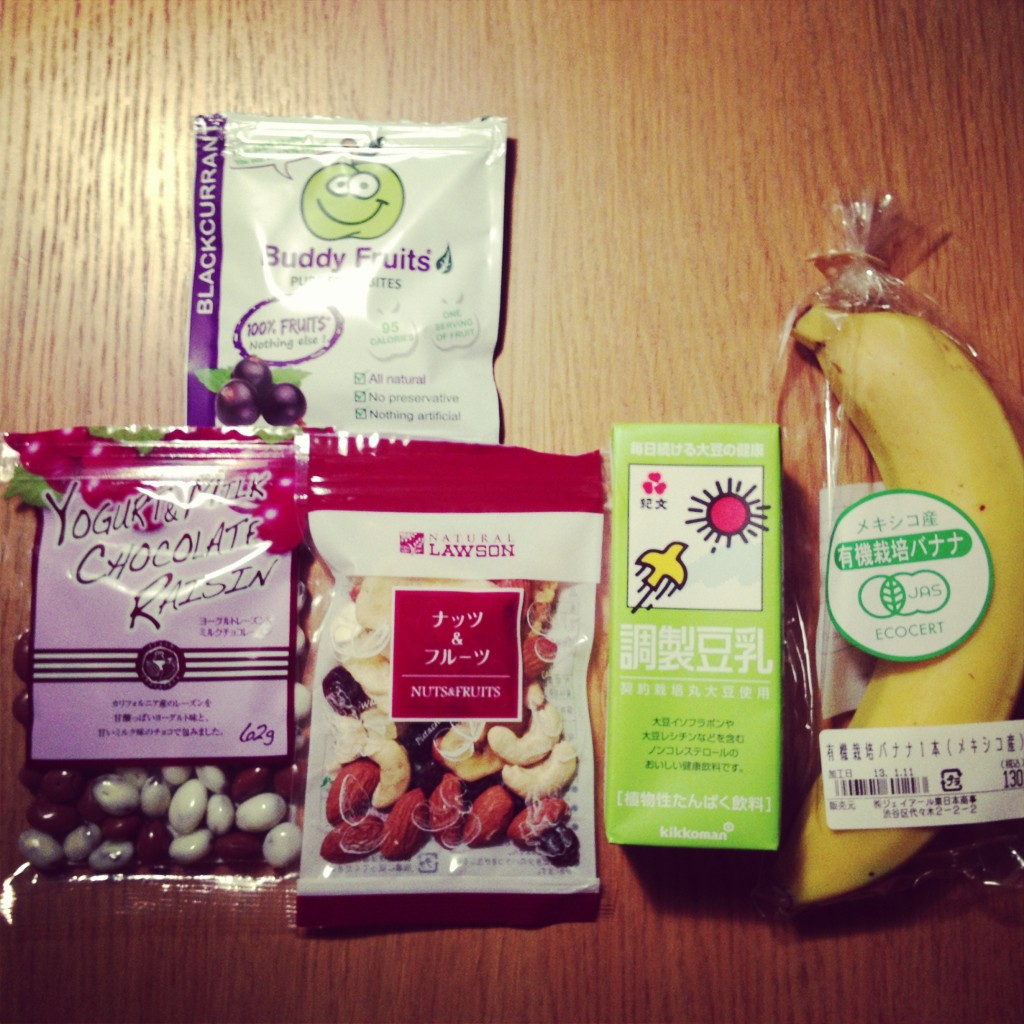 実はこれ、全部ナチュラルローソンで揃います。ナッツ&フルーツなんて軽いのに一袋で200kcal以上ありました。他にマクロビのクッキーなんかも売っていて、なんだコンビニでも探せばジェルの代用品って色々あるな、と。ちなみに豆乳とバナナはトレラン後のアミノ酸サプリの代わり。いつもアミノ酸はサプリで補給していたけど、なるべく普段の食べ物(飲み物)で摂ってみようかと考えました。