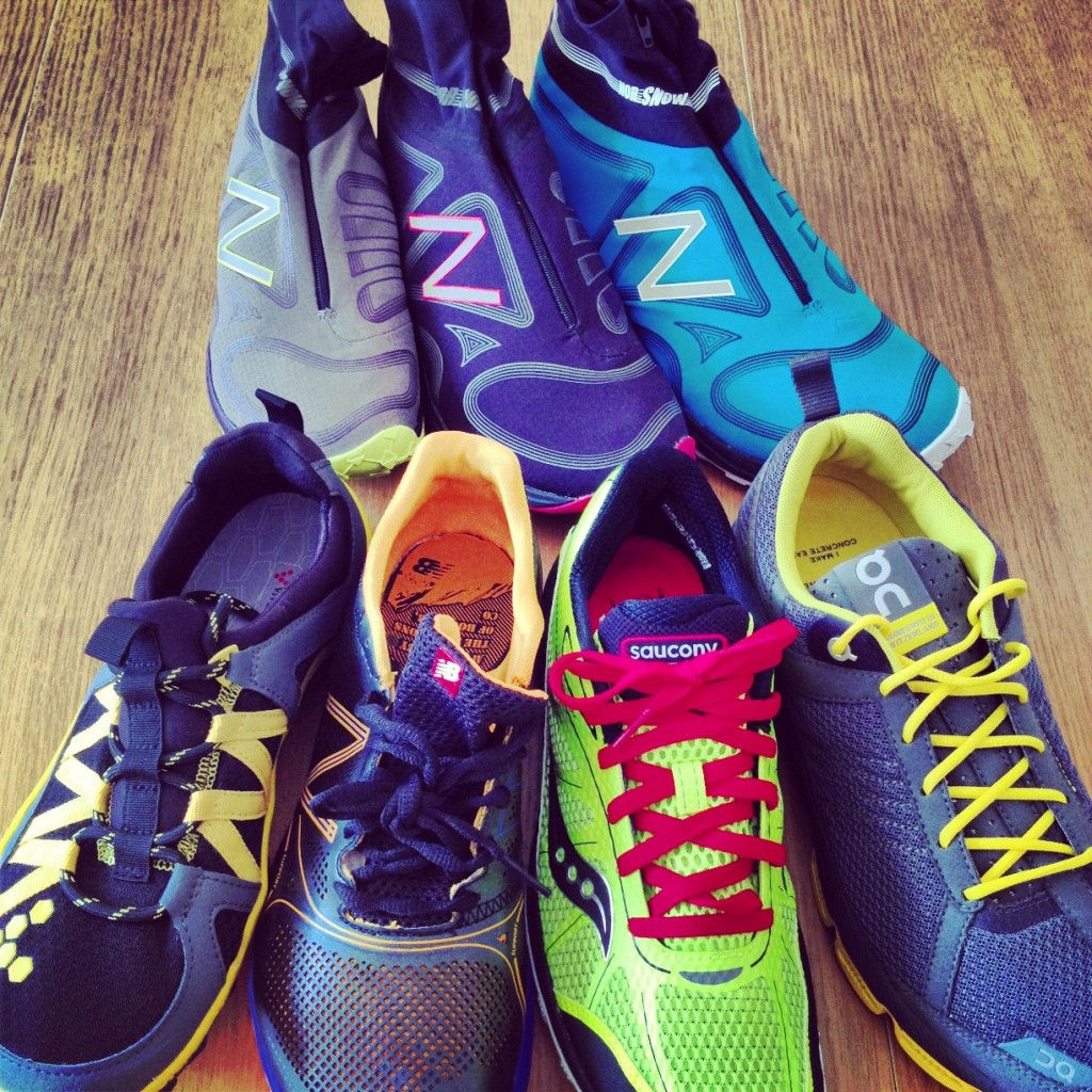 左上から時計回り NB MT110WT3足(一番左はWomen’s)、ON cloudrunner、SAUCONY KINVARA TR、NB MT110(2Eサイズ)、VIVOBAREFOOT Breatho TR *サイズや数量が限定されますのでご了承ください。