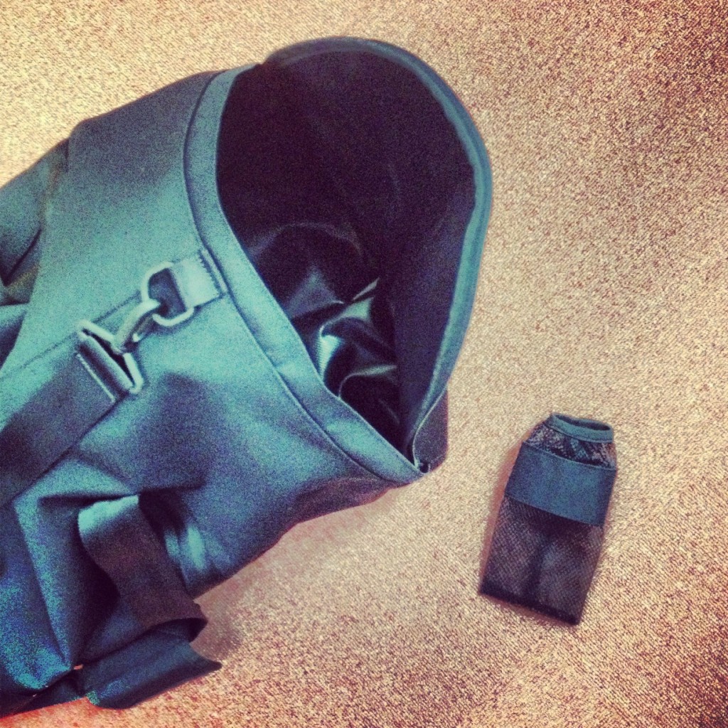 左「ダッフルバッグ」-トレラン移動用のデカバッグ。サイドはインナー防水でシューズもそのまま入れられます。バッグ自体も水洗い可。右「ゴミ入れ」-ザックに取り可能。ジェルの切れ端とか落とさないでここに入れてね!