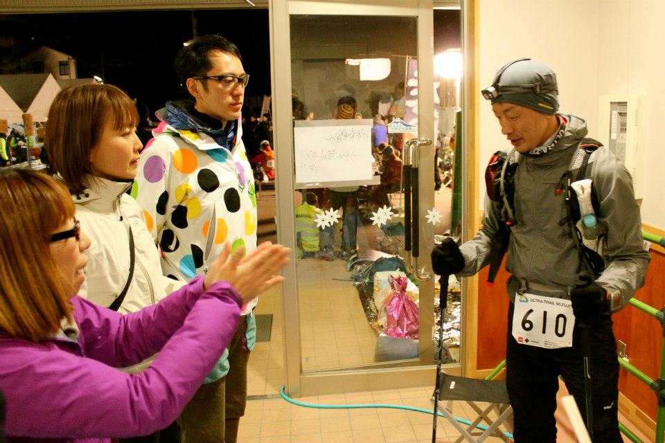 ・A10西富士。これが最後のエイド。まずはライトの交換などやるべきことを済ませる。時計とSTY組の情報、試走時の印象などを考えると、37時間台は間違いなさそうだ。うまく行けば36時間台が出るかも。疲れもあるし、ゴールまで4時間ちょい、最悪でもMAX5時間と見積もった。幸い脚も残っていて、昨年の終盤同様調子は上がってきている。最後の勝負に向け、サポートが作ってくれたおかゆ2杯、お汁粉、アップルティーにパンを浸したものなど腹いっぱい食べる。この後しばらく登りが続くのでここは腹いっぱいでも大丈夫。消化する頃には下りとなり、そこで爆走するためのエネルギーになるはず。ここまで多少違和感が出たときもあったが、概ね胃は元気。生まれつき胃が強いことに感謝だ。あまり長居せず、いよいよ最終パートへ。午前0時近く、休憩で冷えたため念のためパタゴニアのフーディニパンツをこのレースで初使用。