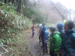 まずは金時山からスタート。総勢18人、大所帯でのぼり始めます。速い人はどんどん駆け上がっていきます! 山ですれ違う人とは必ず、こんにちは、と声をかけます。そして、どちらかが端に寄って道を開ける。なるほど、これが山のルールなんだな~と、ごくごく基礎的なマナーを学ぶ。