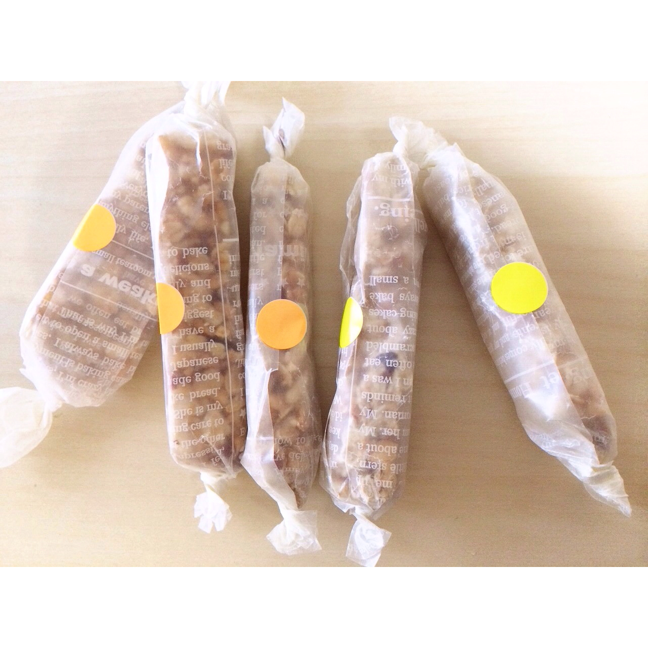 ワックスペーパーに包んで留めたらなんだかかわいいスイーツみたいになりました。グラノーラ1袋で30本以上できました。多っ。