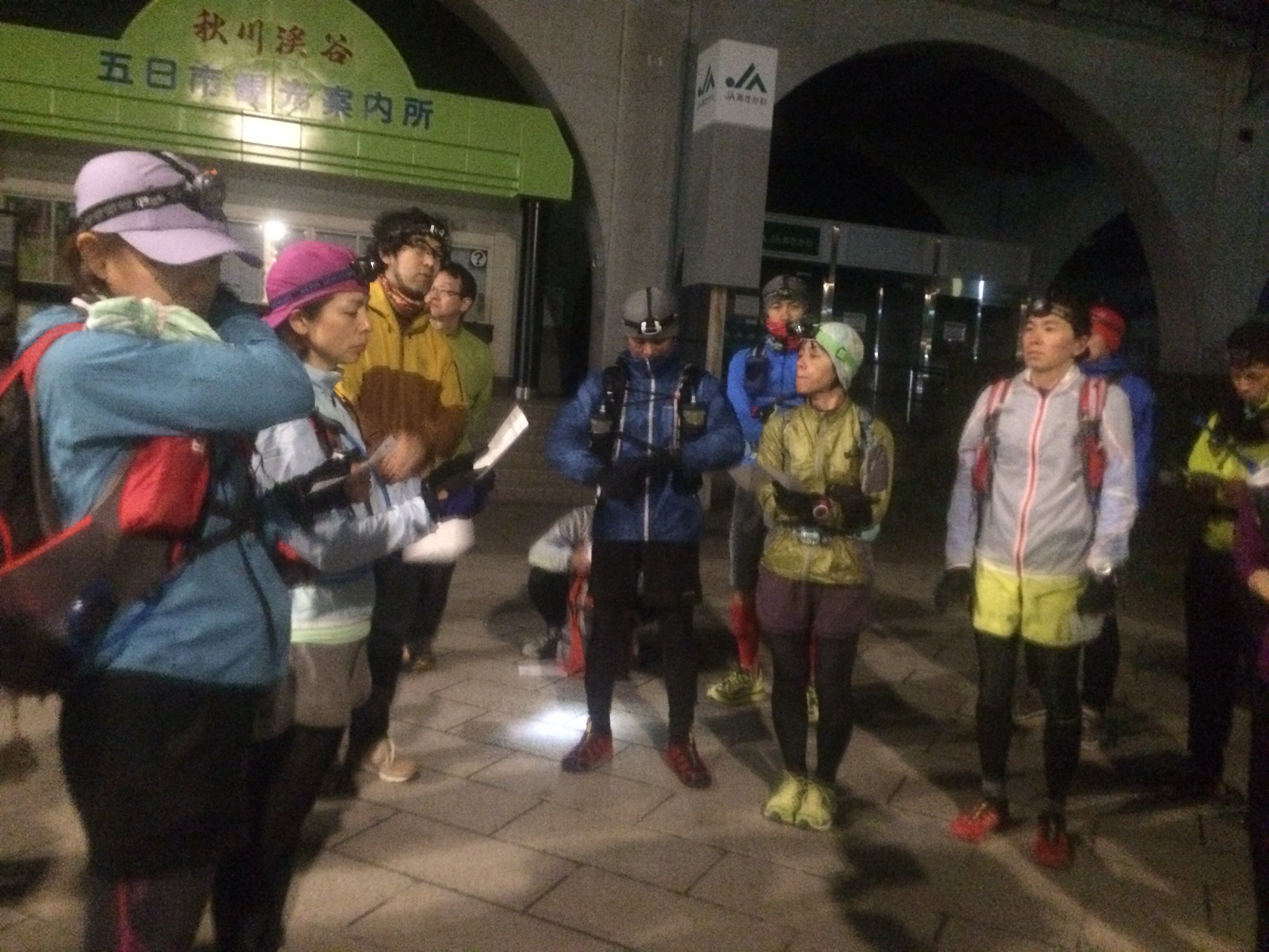 武蔵五日市の駅に続々と集まるトレイルランナー。なんとこの日の参加者は約40名!私は信越を除くと、初めてのナイトラン。日中はひとりでも山に行けるけど、やっぱり夜となるとそのハードルは高い。同じくらいの経験やレベルの人だけで行くのも勇気がいるし、やっぱり熟練のトレイルランナーについていくのが一番いい。でもなかなかそういった機会も少ないまま大会を迎えるのは不安なもの。そういった同じ状況の人達が集まっている様子。