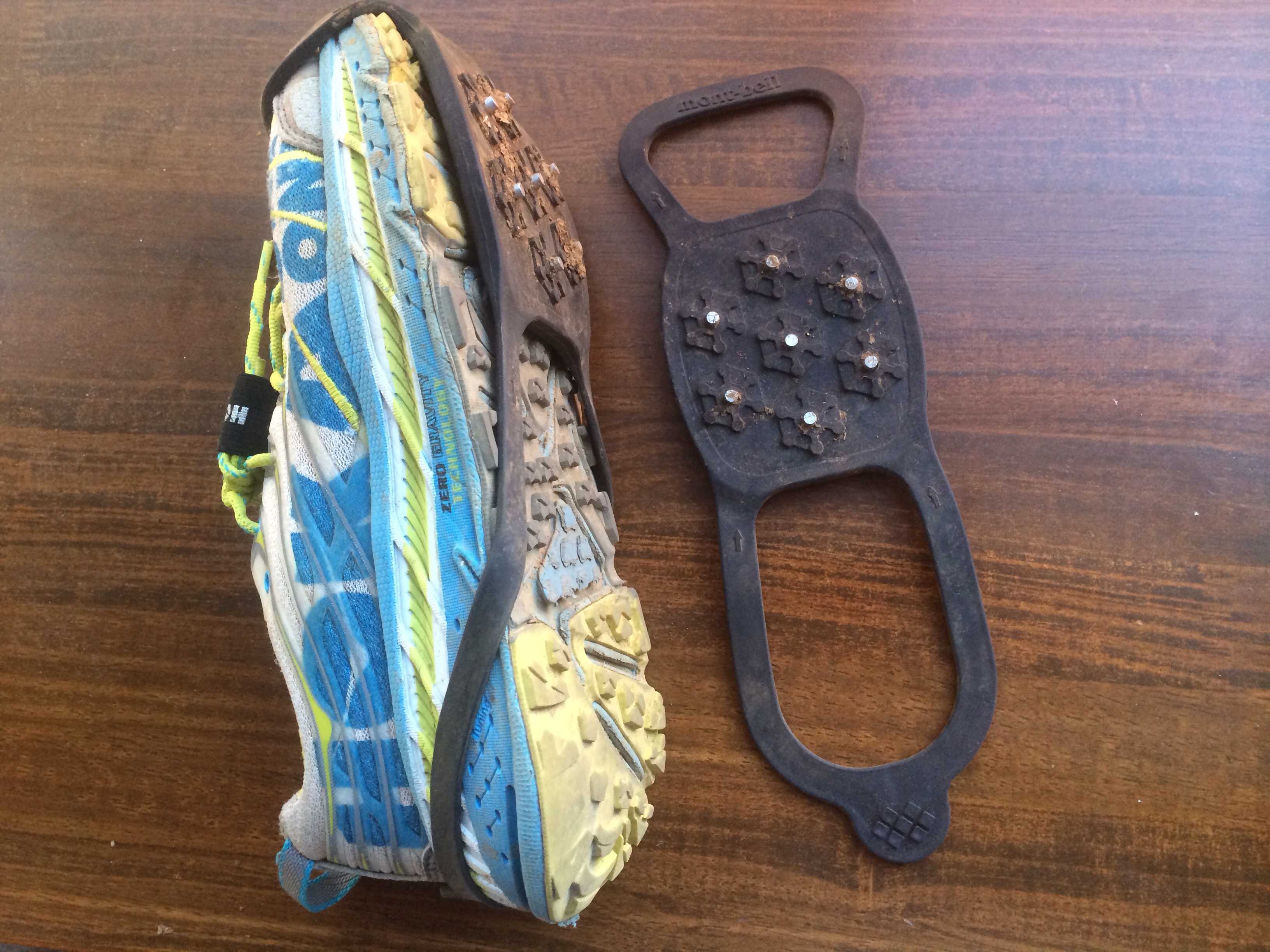 後半では雪が残っていて滑って足をとられるという場面も。UTMF/STYまでに富士山周辺はあとどのくらい融雪するでしょうか。凍った雪の上でHOKAはツルツル。ちょっと心配になりました。途中でモンベルのリバーシブル グリッパーを使ってみたりもしました。チェーンスパイクほどではないけれど、ちょっとだけ安心感がありました。軽くて、チェーンスパイクよりもシューズにフィットします。
