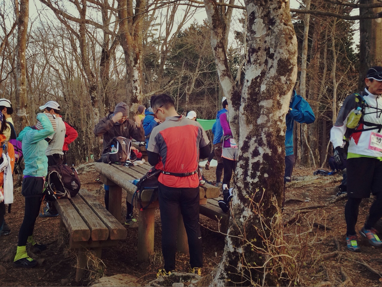陽が暮れて行く。遠くに見える夕日を楽しみながら、すこしずつ訪れる暗闇にわくわく。だけどここからは激下り激上り激下り。とにかく、文字のごとく 【 M 】すぎるコース、熊森山から雪見岳へ。とにかく滑りまくる。途中、足を踏み外し頭から2mくらい滑落した女性も。咄嗟に周辺の男性が引き上げて、おそらく大きな怪我はなくコース復帰。その他にも、足を滑らせてお尻を強打してうずくまる男性、変な転び方をして腕を押さえる女性(結構酷そうだった)、目の前で足を挫く男性。とにかく渋滞の中でだらだらペースなのに、怪我をする人が続出でした。あまりに進まない渋滞に目標時刻をはるかに超えてちょっとハラハラしながらも、おかげで相変わらず補給は順調。なんとか雪見岳を下りきって麓エイドへ到着しました。もう真っ暗でした。
