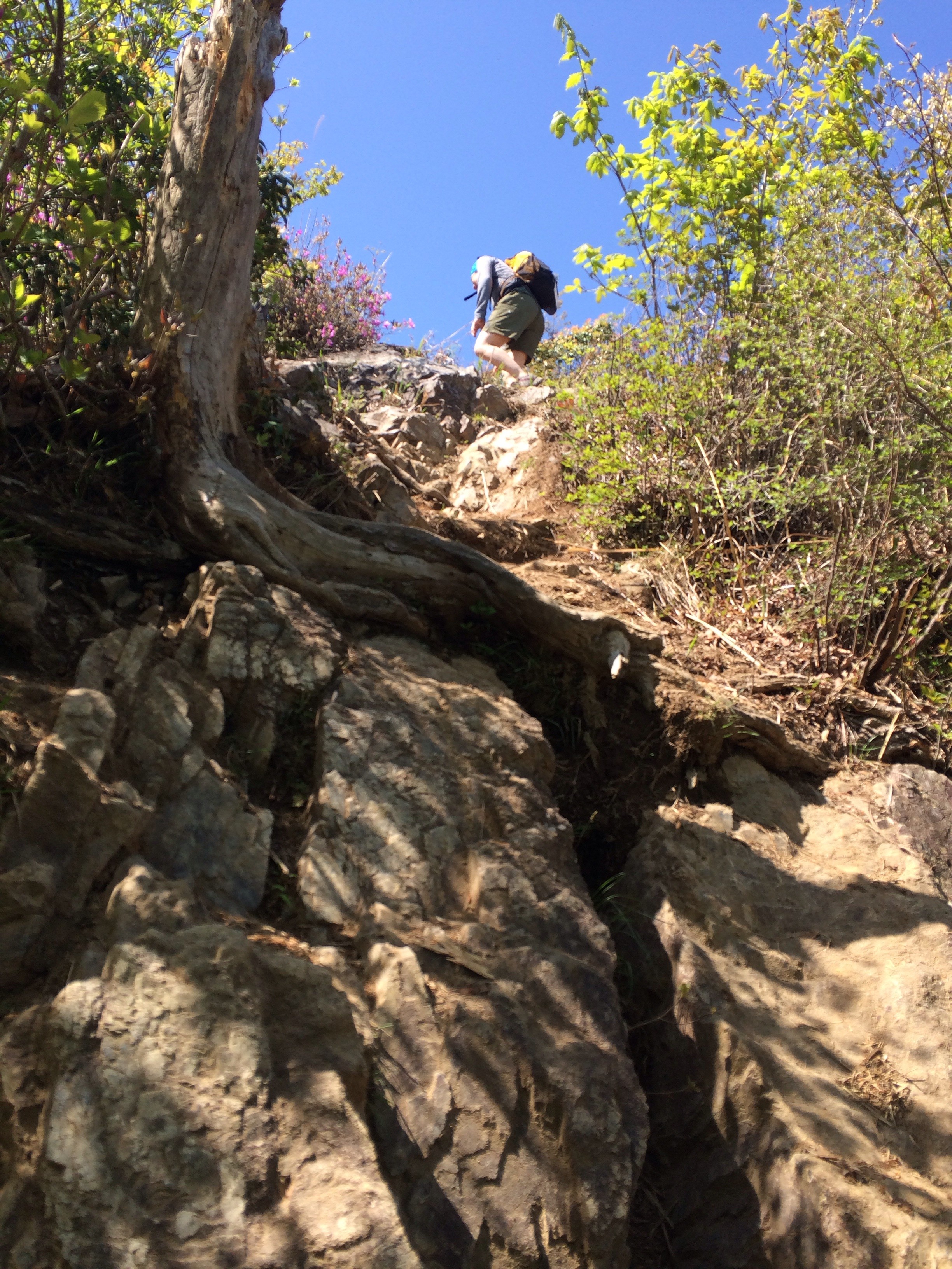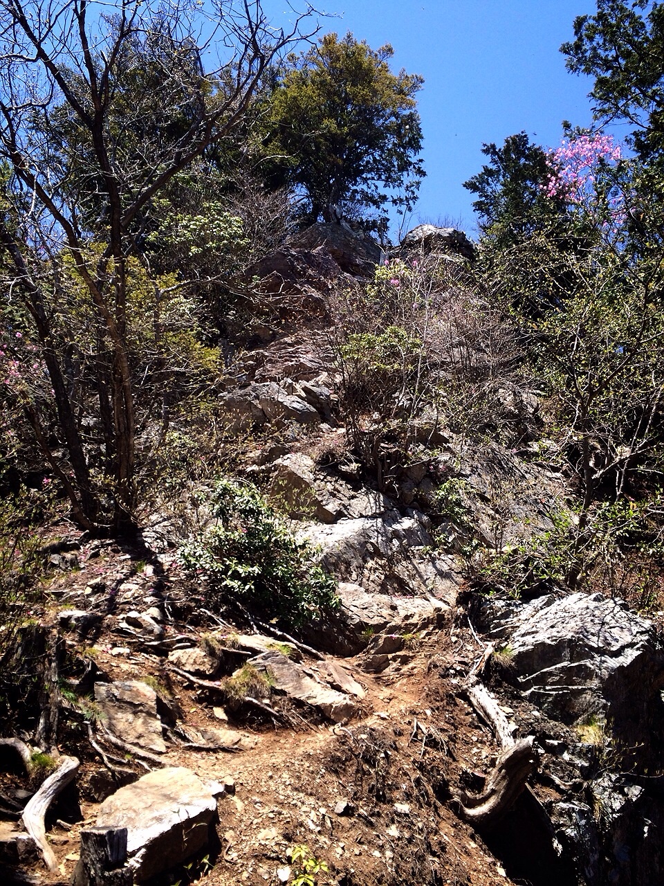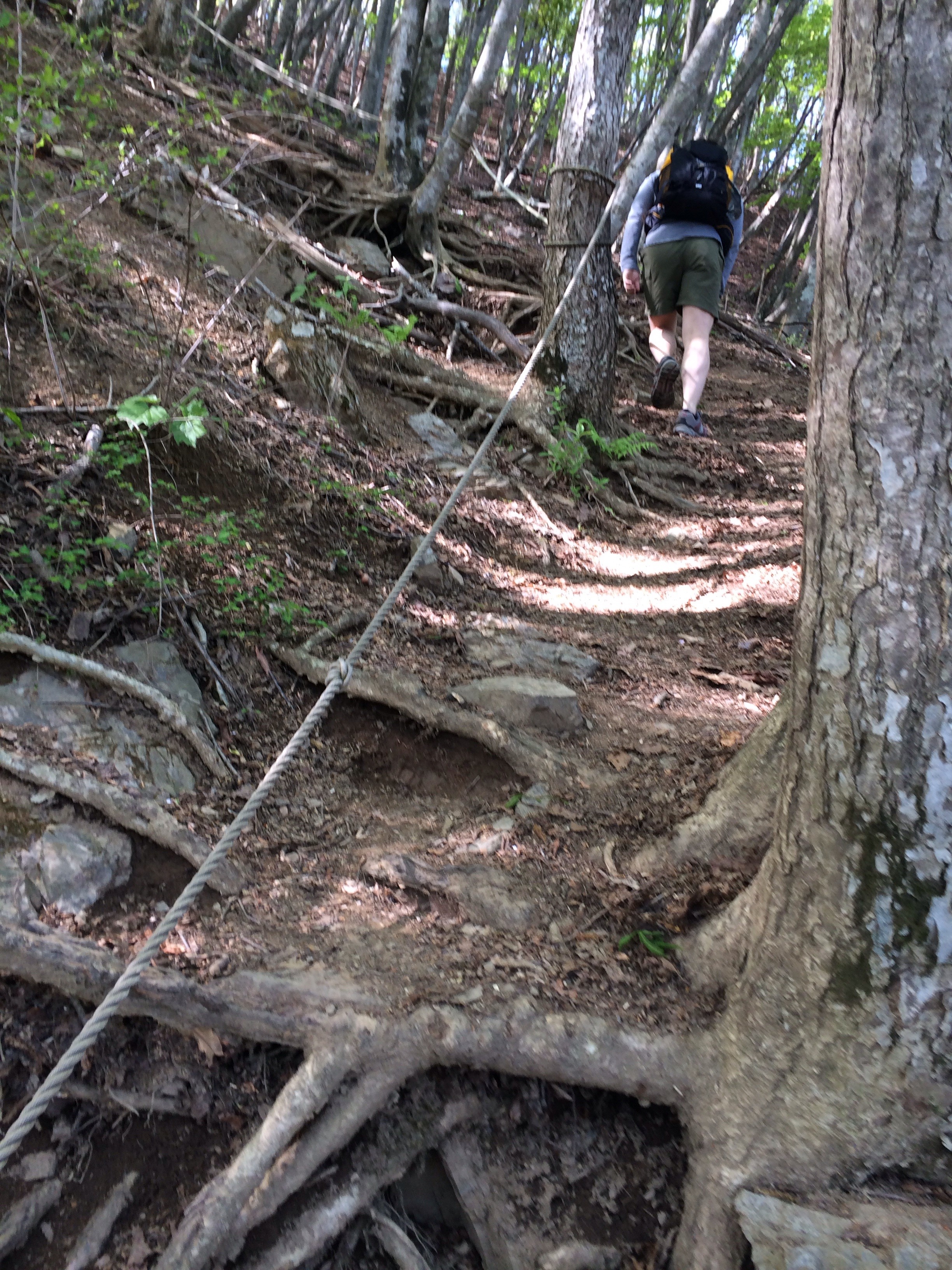 どんどん急坂になってきて、しまいにはロープ登場。ハイカーさんはロープに縋り付きながら登っていて、確かにこりゃ大変だ。最初からいい上りのトレーニング場所発見です。