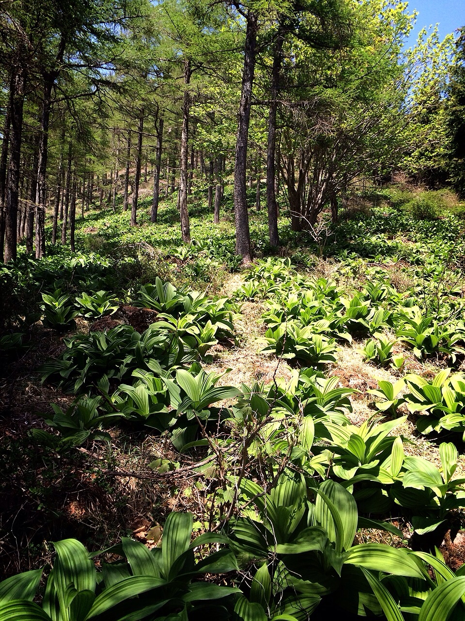 トレイル脇にはバイケイソウが群生していて一面緑のじゅうたん。“一直線の急登”と聞いていたので相当な覚悟で挑んだけれど、意外にも小刻みな九十九折に登ることができるので想像していたような辛さはなく、あっという間に登り終えました。