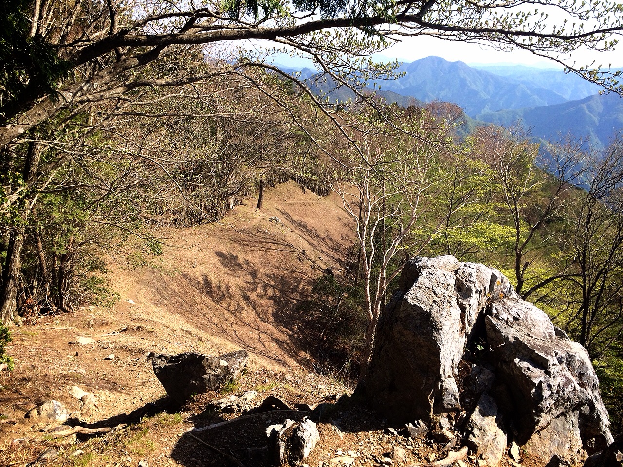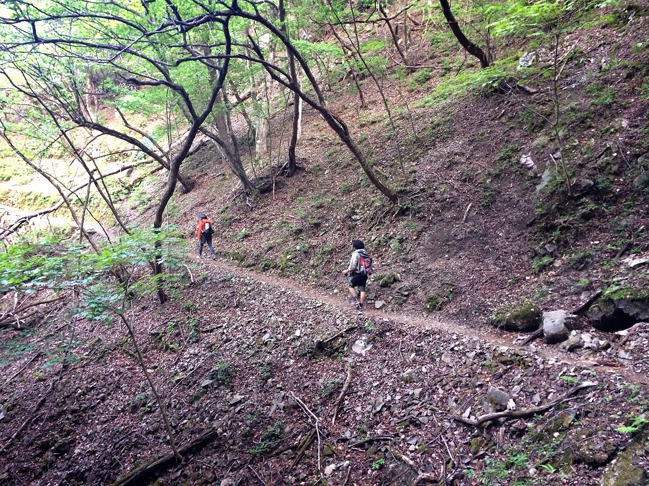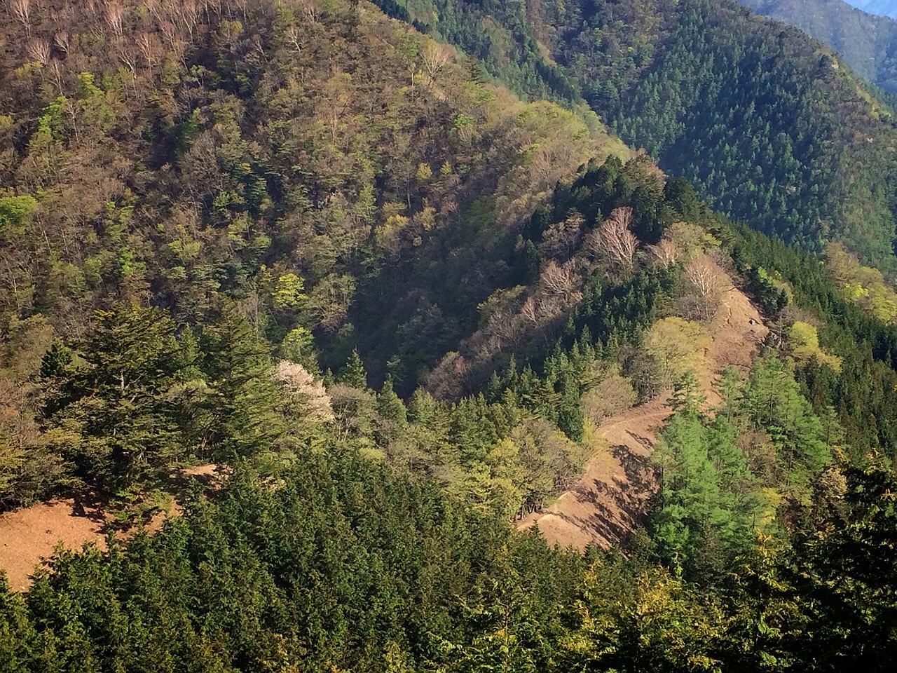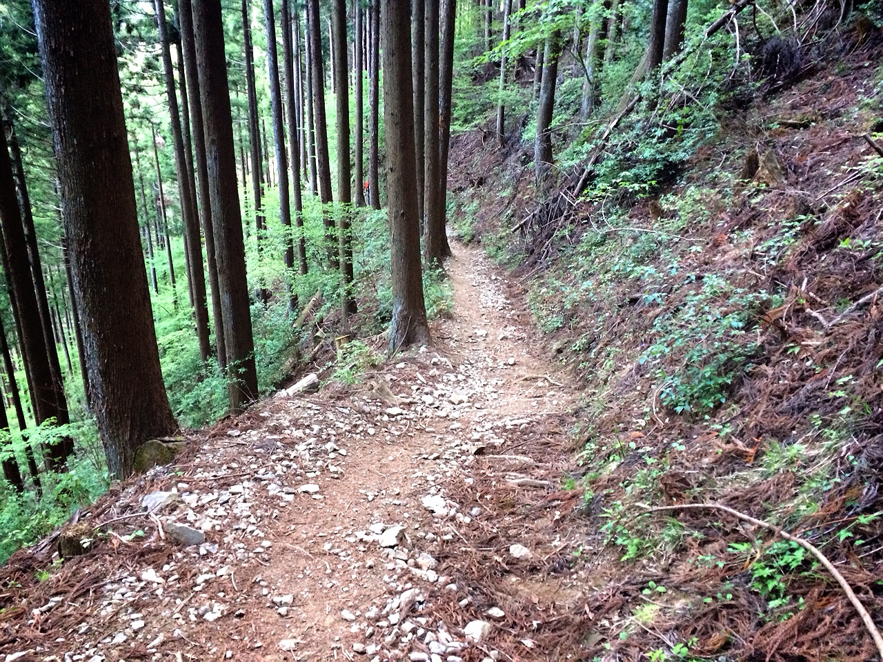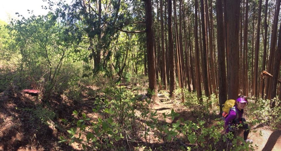 川苔山からは曲ヶ谷北峰という分岐から下ります。とにかく、ほぼロードに出ることなく、ずーーーーーっと下りのトレイルが続きます。(ハイクで2時間)トレイルランナーならひたすら走って下りることのできる最高の下り。変わった鳴き声の鳥と会話(?)したり、歌を歌ったり、なんだかそんなのどかな様子で歩きました。