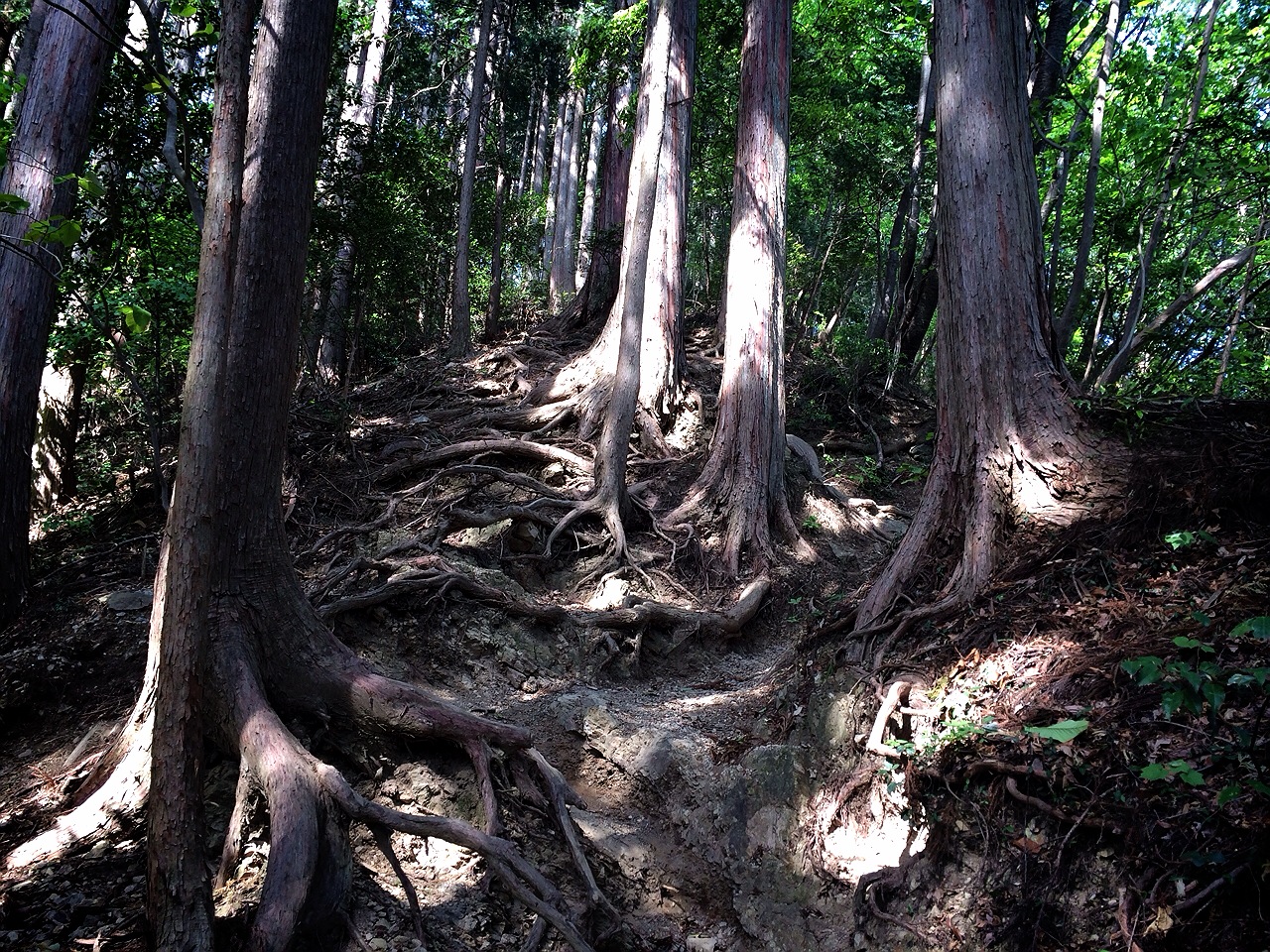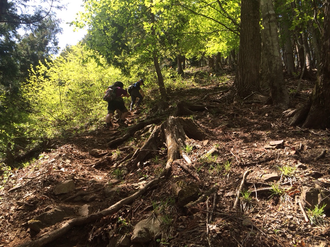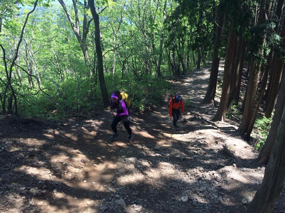 この滝ノ平尾根、根っこの這う上りで、なかなか登り甲斐がある。そしてまったく人に会わない。登りが30分プラスされることもあり、こちらのルートを選ぶ人は少ないらしい。過去に行方不明者も出ているけれど、日中は特に迷うような場所はなかった気がする。たまにロードを渡って再度トレイルに入るところがあって、ロードではバイクトレーニングをしている方が多かった。ロープを使って登る場所もあったりなんかして面白い。ただ、とにかくひたすら登る。下りはほぼなし。