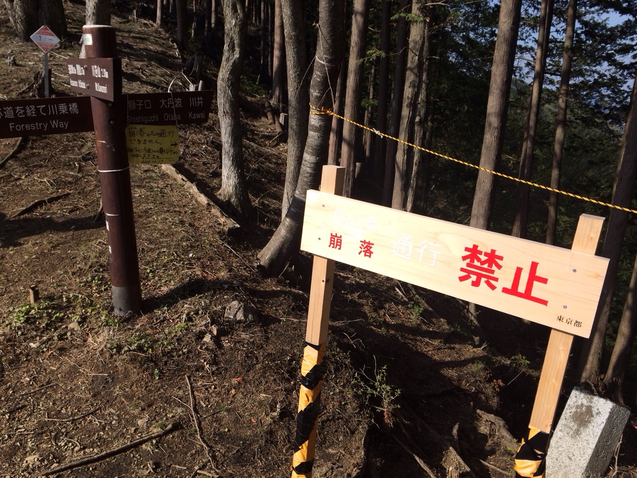 川苔山までの途中に何度かある分岐ではかなり多くの場所で崖崩れや橋の崩落、残雪などで通行禁止になっているという標識がありました。つい最近の日付が入っているもの、なかには駅に降りるルートもありました。引き返すにも時間のかかるところで、エスケープルートも少ないので計画時には要注意です。