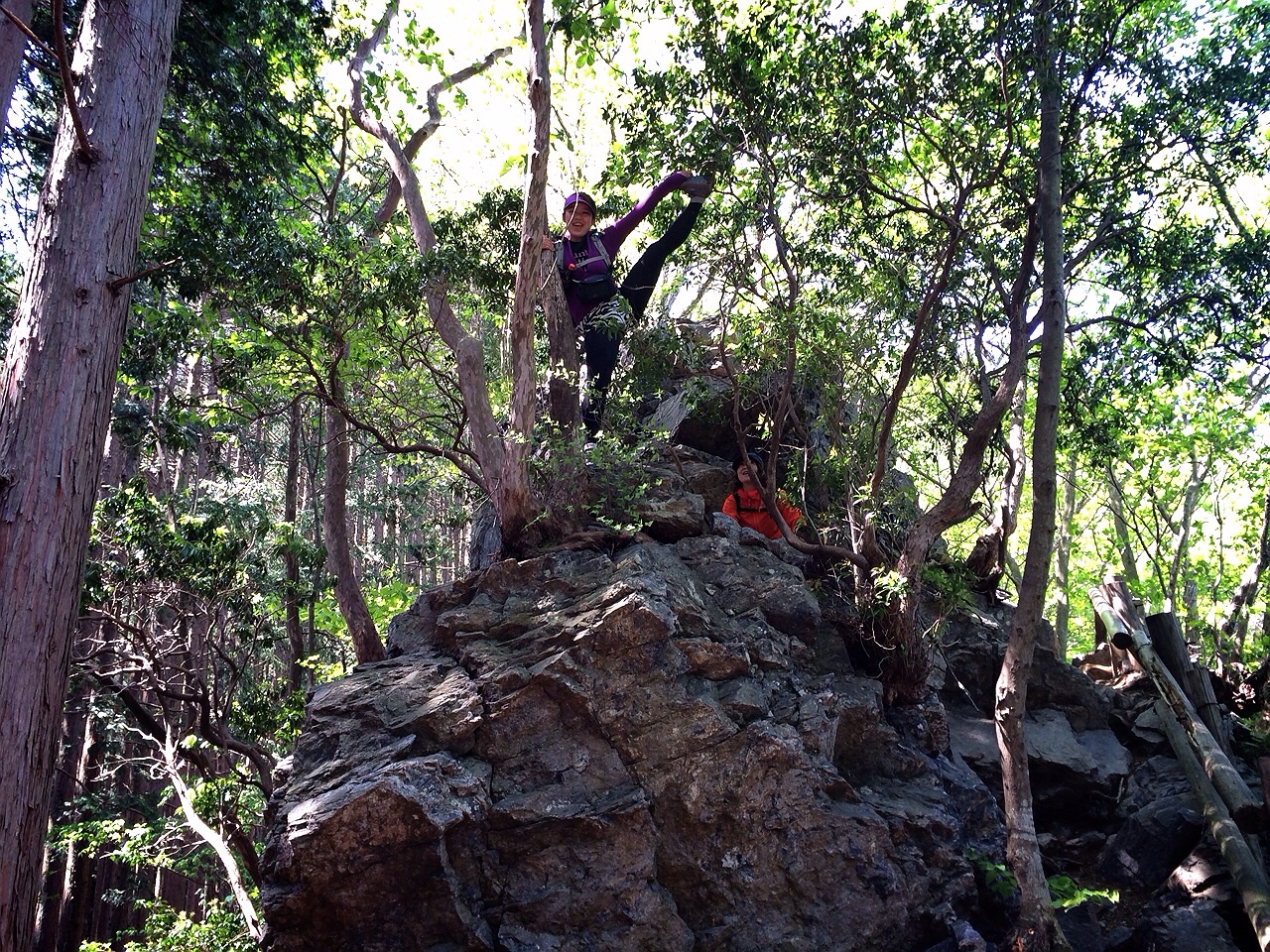 棒の嶺前の2つのコースが合流するところに大きな岩!(岩茸石) 高い場所が好きなわたしは登ってポーズ。