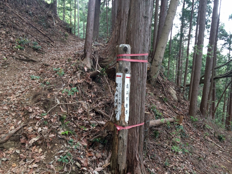 逆走(関八州から高山不動)の時、毎回迷いそうになる分岐。振り返って写真を撮ってみた。写真左のリボンが付いているところに実はトレイルがあって、そこを下ると高山不動の裏に着く。これ、うっかりしていると明らかにそのまま直進しそうなので要注意。文字が消えまくっている右の標識も気にせず、何の標識もない左に折れなければならないという難関の分岐。
