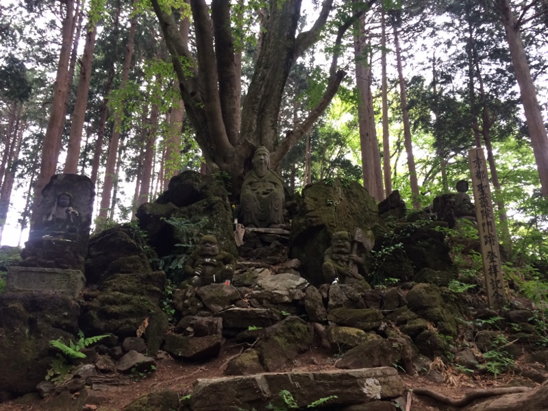 黒山三滝から30~40分ほど登ると、少し広い分岐に出て、突然現れるのが次のポイント。役行者像。山の中にある不思議な場所。大平山 山頂。1865年に建立された歴史の古いもの。何者かに壊されて一度作り直されています。ここもまた、修行の道のひとつだったよう。拝んで次へ進みます。