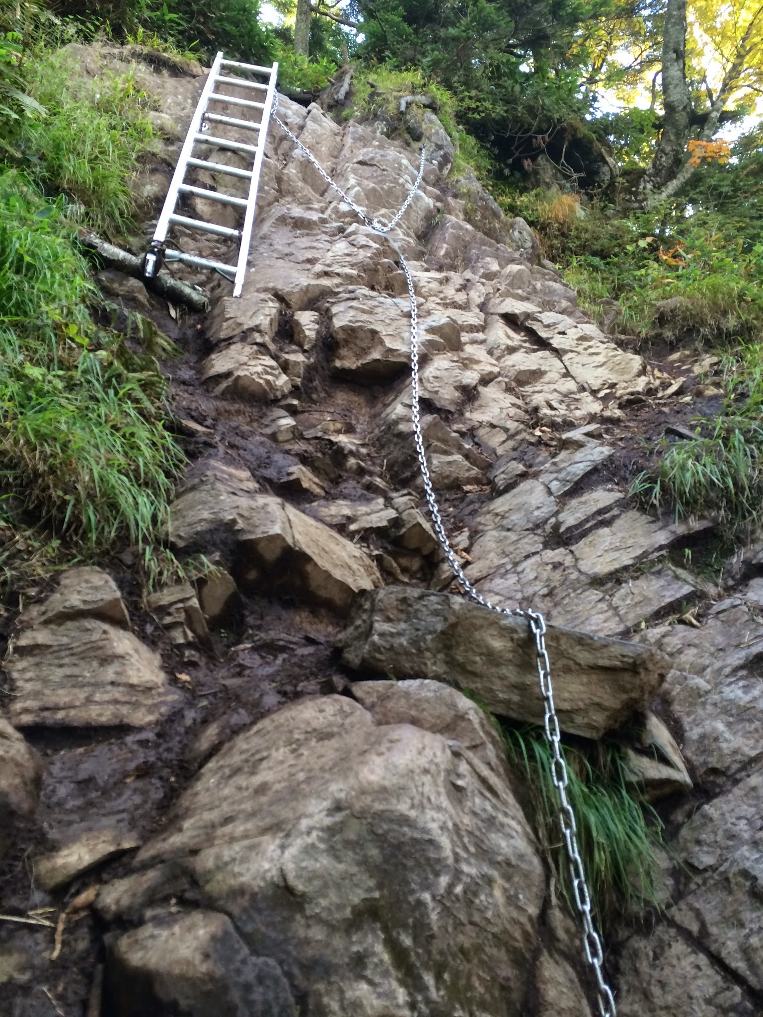 ホールドになる足場はしっかりしているけれど、想像以上の岩。登り切って、ホッしているとまた、鎖と梯子。2つあったのかと思っていると、また。さらにその先には連続梯子。スタッフの方に「山頂はもうすぐですかね?」と声をかけると「最後の梯子を追えたらちょっと行って、山頂ですよ」と、確かにそう言ったと思う。