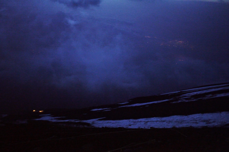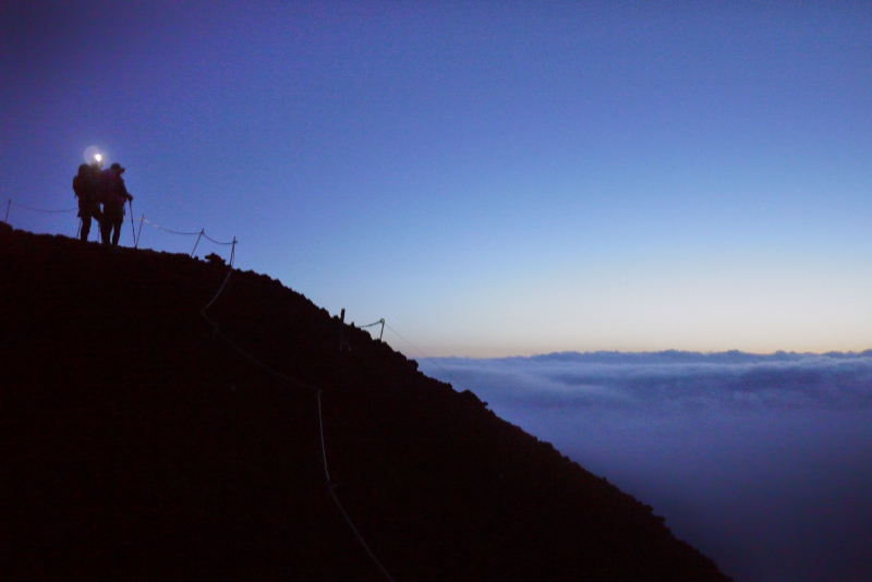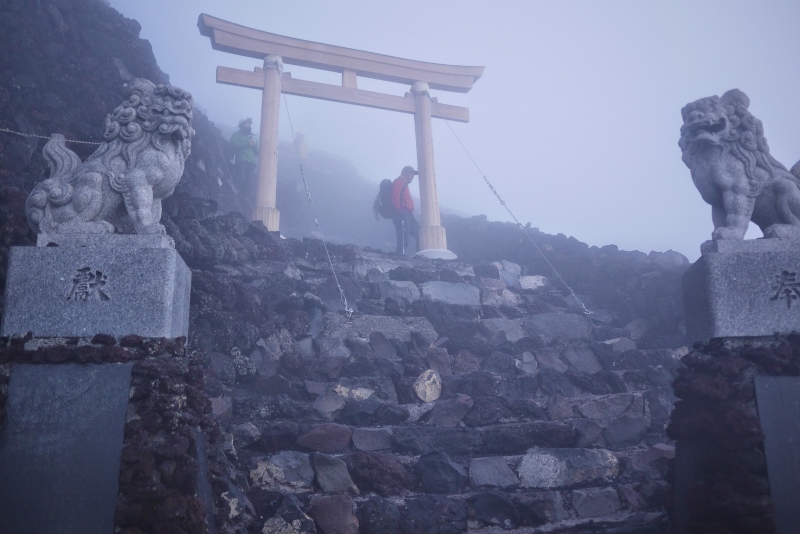 五合目からは、六合目、七合目と進むごとに1人会うか会わないかくらいの人の数。もちろん山小屋など空いていないしトイレも使えないけれど(一部は山開き取材のメディア向けに開けていた)、静かな富士山を登ることのできる贅沢さ。呼吸を乱さない範囲で、じっくりと登る。夜景が見えていたはずが次第に雲が厚くなり、山頂手前では真っ白に。