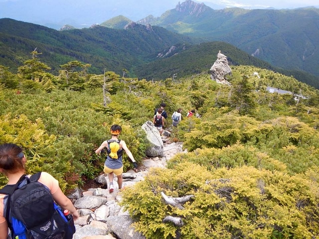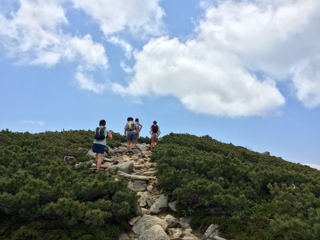 朝日岳から金峰山へ向かう道もまた、すごくいい。低山にはない解放感。空が近い。こういう場所にいると空を飛びたくなるのはわたしだけでしょうか。(笑)思わず立ち止まって深呼吸したりなんかして。この日の前日まで、数日間PCに張り付いての作業が続いたので、全身が解放されていく気持ちよさ。頭も身体もスッキリする。なにより、みんなでくだらない話をしたりして全身で笑って過ごすことの楽しさったらもう!大人らしからぬはしゃぎっぷりで、うっひょー!と雄叫びを上げて駈けまわる。