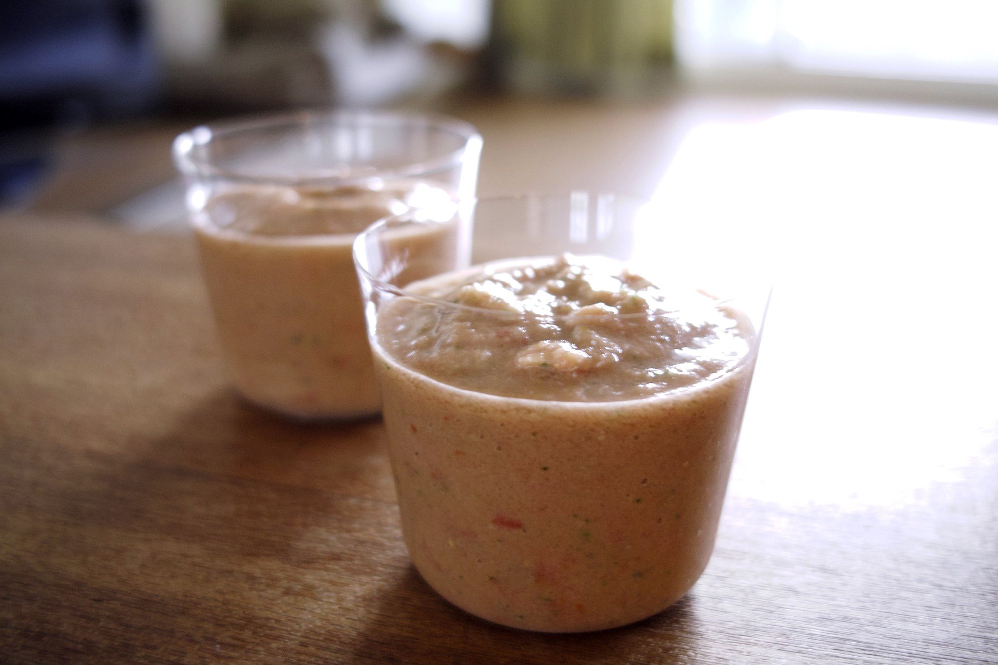 どろどろした食べるスープ。にんにくとか入れると夕飯な感じに。キリアン選手のレシピは確かトマトジュースがたくさん入っていて真っ赤、濃度もそれほどどろどろでなく飲みやすかったです。