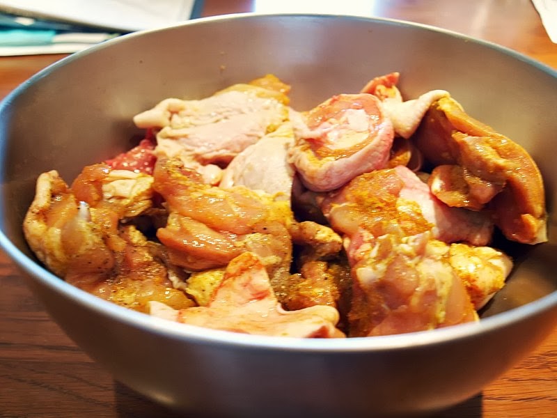 - 骨付きの鶏もも肉のぶつ切り、または骨付きラムチョップに塩・こしょう・カレー粉・にんにくのすりおろしをもみこんでおく。それを1とは別のフライパンで焼きつけ、1に加える