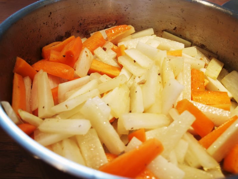 - 2で使ったフライパンで厚めの短冊切りにした大根とにんじんを炒め、1に加える。