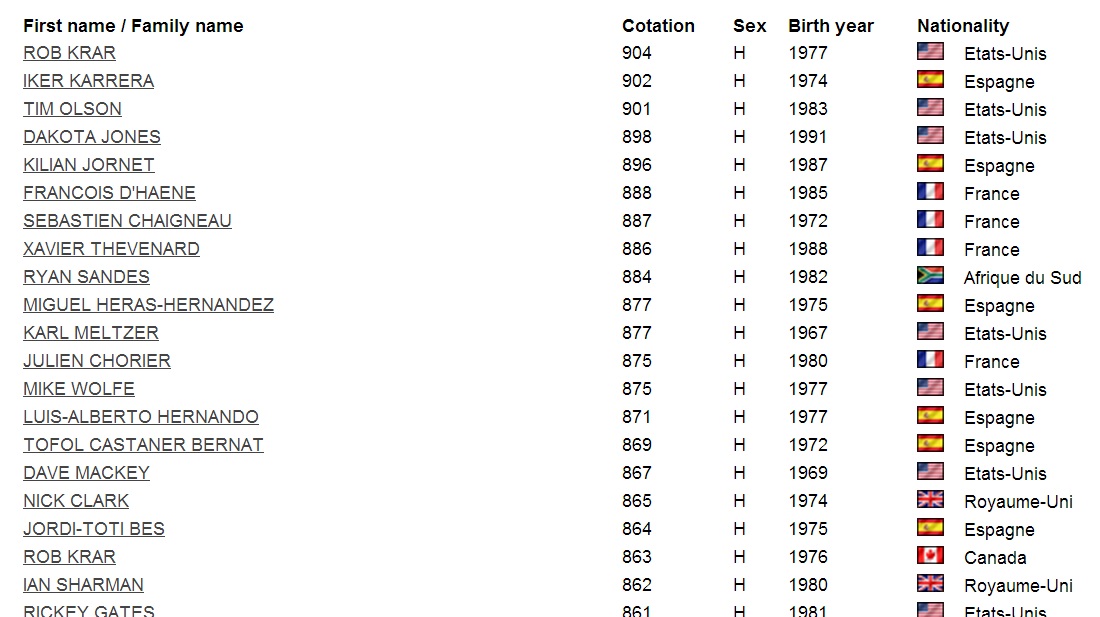・・・って、あれ、ロブ・クラーは19番目にも名前が出てますね。どうもカナダ国籍でレースに登録されていたか、US国籍で登録されていたかで分割カウントされてしてしまったようです。ということは、真のトップはイケル・カレラ/Iker Karrera(スペイン、Salomon)!