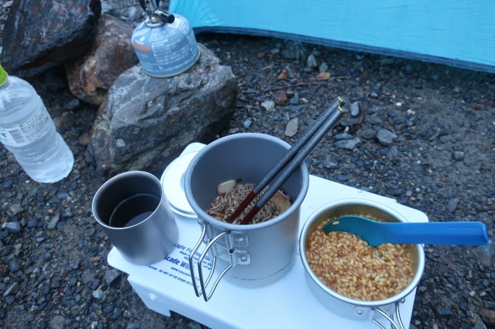 やることも無いので早めのご飯にした。山の楽しみの一つとして山ご飯がある。なので少しは気の利いた事でもしたいのですが、今回は特に縦走の練習という事もあり、小型軽量のため味気ないインスタント系になってしまう。味は間違いないですけどね。この辺りは特に数をこなして自分なりのスタイルを確立したいものです。