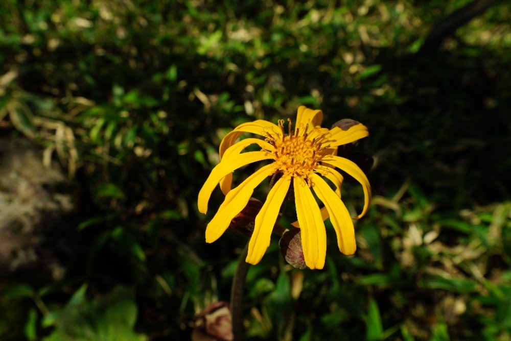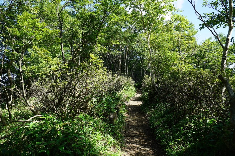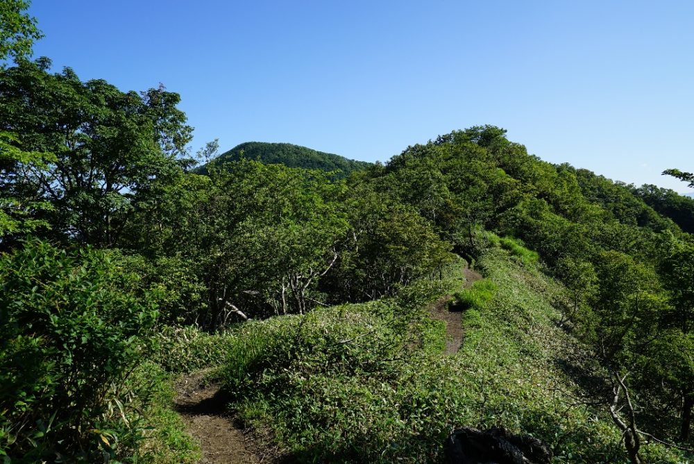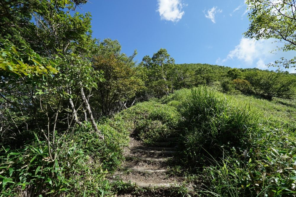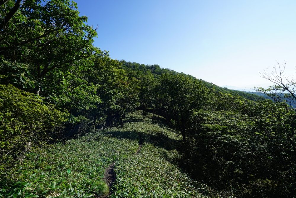 正ルートへ復帰し稜線へ出る。ここの登山道は比較的人通りが少ないようで、幅狭めな道が続いています。朝露で草が濡れているので、狭い道によって草を避けることができずシューズが濡れてしまいました。