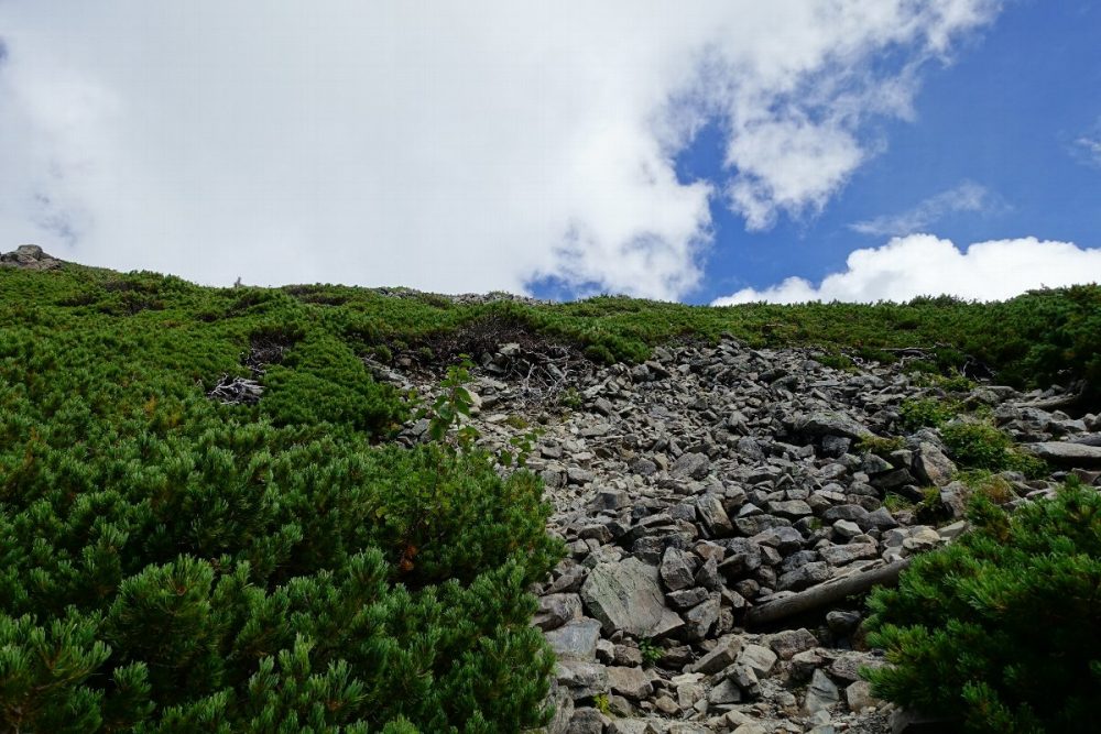 そんな感じで登りつつ、ようやく森林限界を越えました。やっと楽しみにしていた稜線歩きが始まると思うともう嬉しさが溢れてきて、周りに自分たちだけだった事もあり「フゥーッ!」というパリピさながらの声を上げてしまうほどのテンション。完全に浮かれてます。イヤしかし、我らの合言葉は油断大敵。無理せず安全に進むのは忘れません。