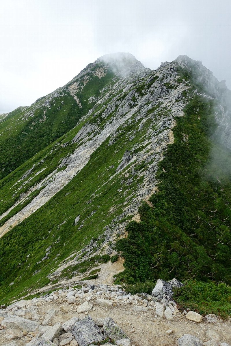 常念岳の手前まで来ました。なんて迫力のある登りなんでしょう!カッコイイ!!そんな悠長な事を言っていられるのもココまででした。。