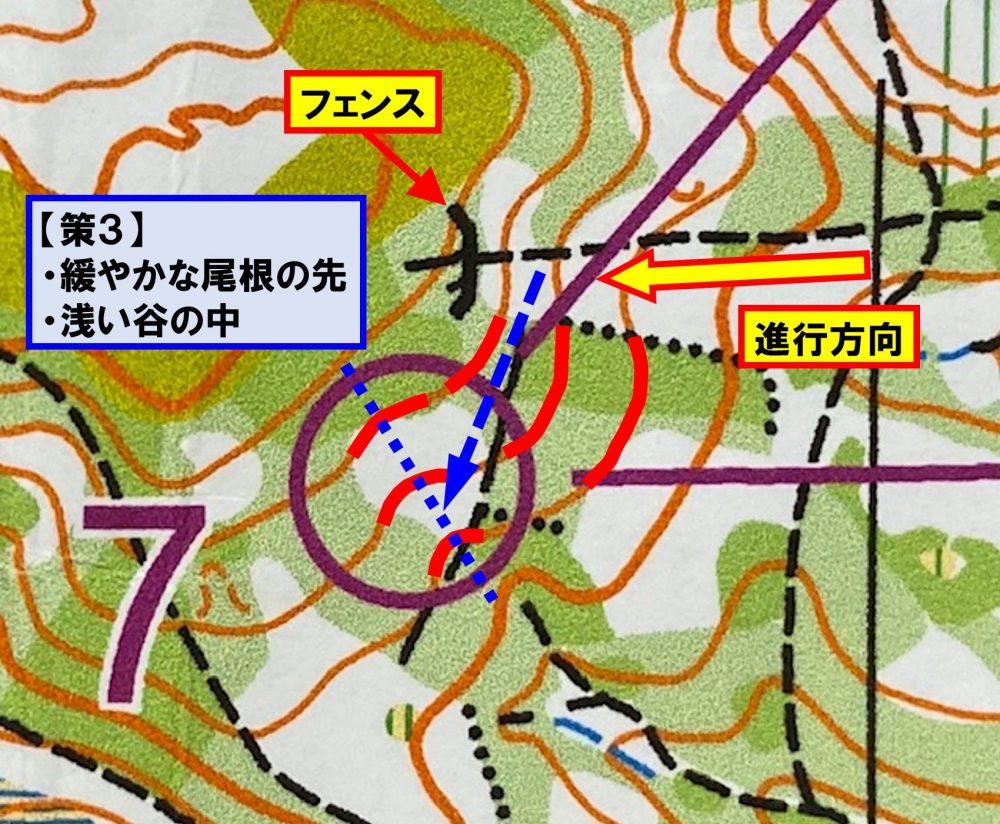 【策3】フェンスを起点として、緩やかな尾根があり、その先の浅い谷の中にある事が分かる。