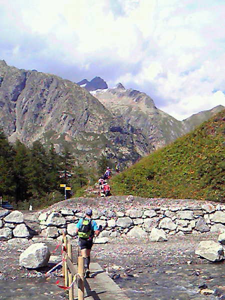 練習方法はいろいろありますが、一つの練習として自分の体重の30-40%の荷物をもって 一日山を歩くことは非常にいい練習だと思います。、その時に足を置いた場所がUTMBでの足場です。あまりに歩幅が狭くまた稼ぐ高低差が少なくて驚くと思いますがこれがアマチュアランナーの長距離の歩き方です。