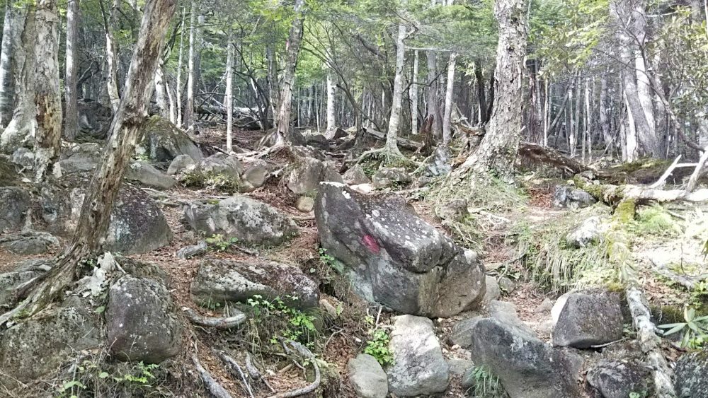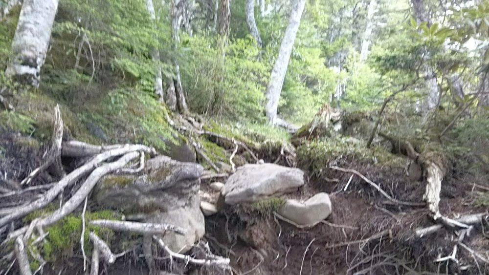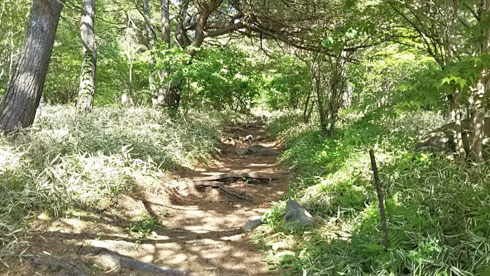 最初は森の中の両サイド笹や草の、土と石の登りを進む、続々と日帰りのパーティーが降りてくる。