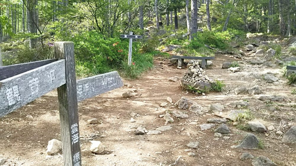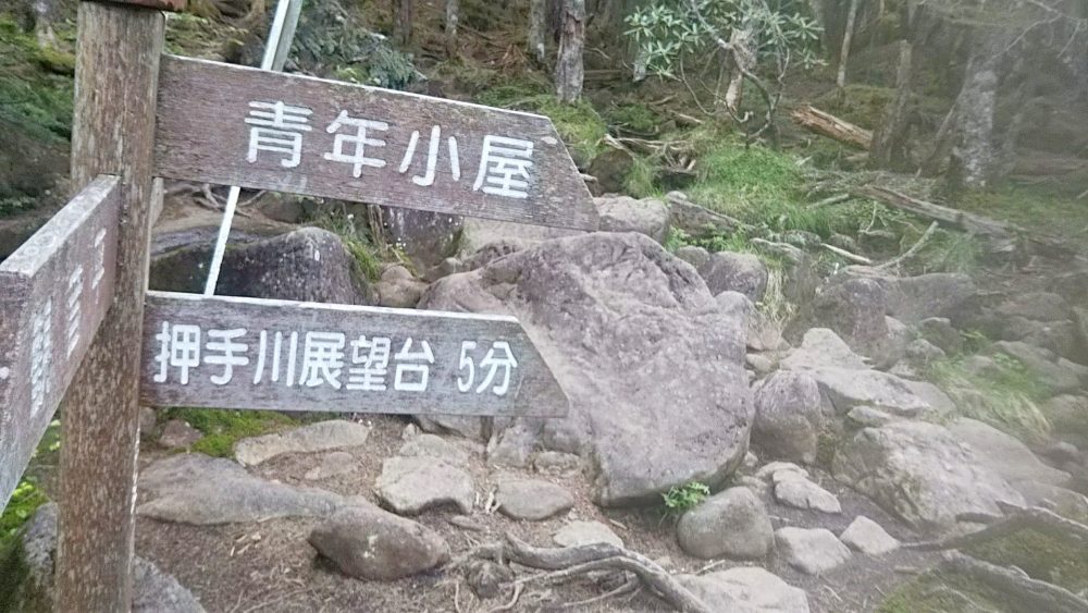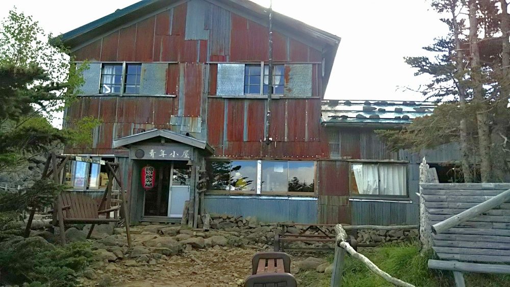2300mの道標まで上がるとあと10分、なだらかになった岩々の道を進みちょうど90分で青年小屋到着。