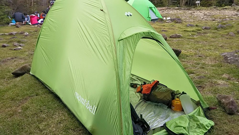 今日はガチな山行ではないのでモンベルのドームシェルターで居住性と張りやすさを重視。