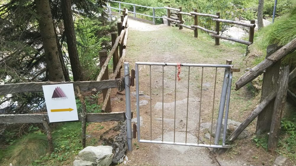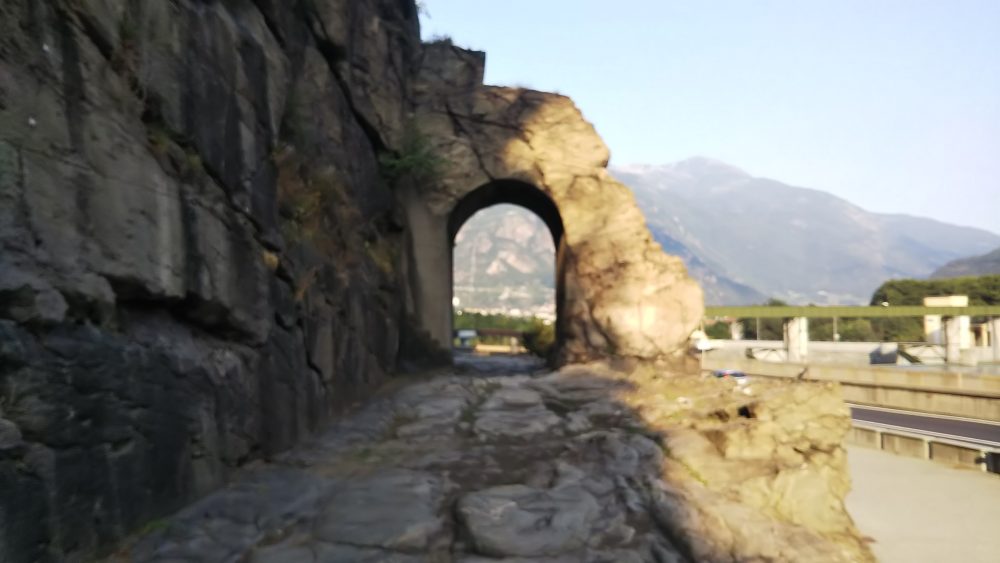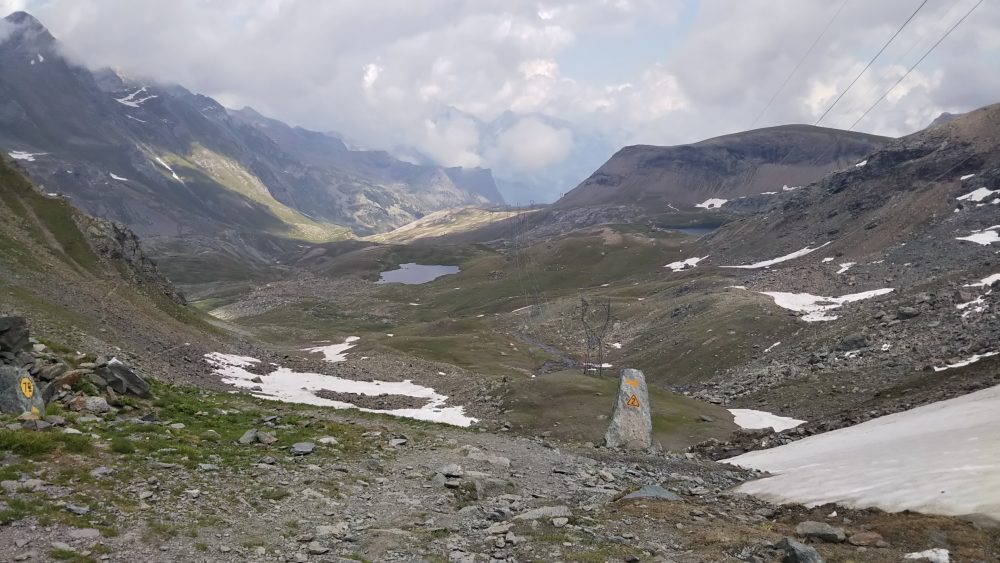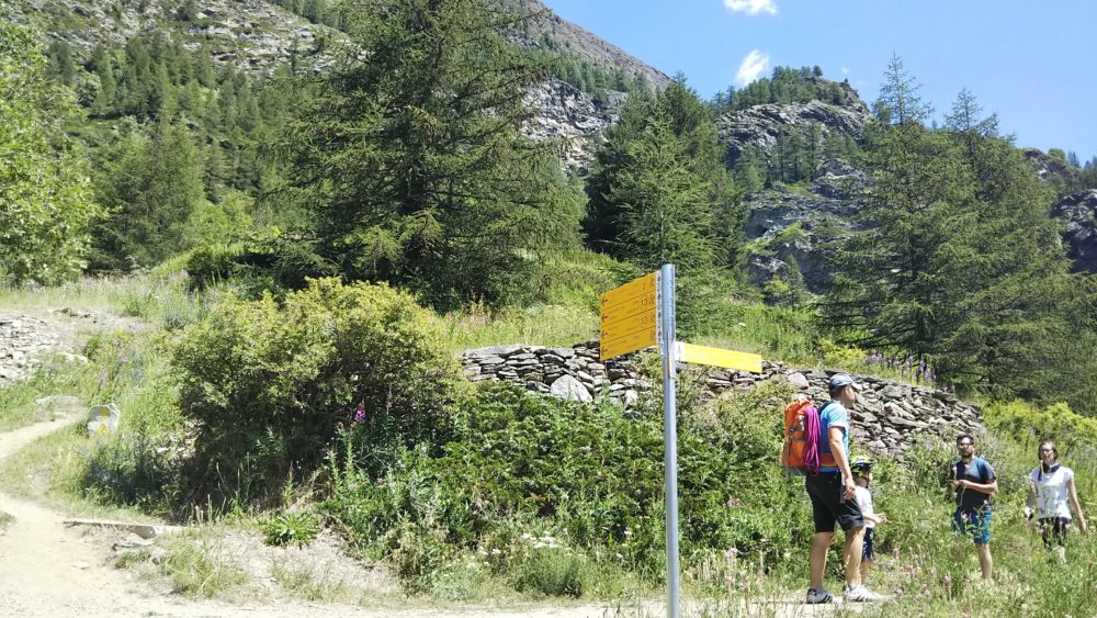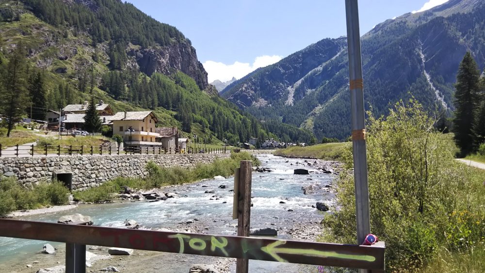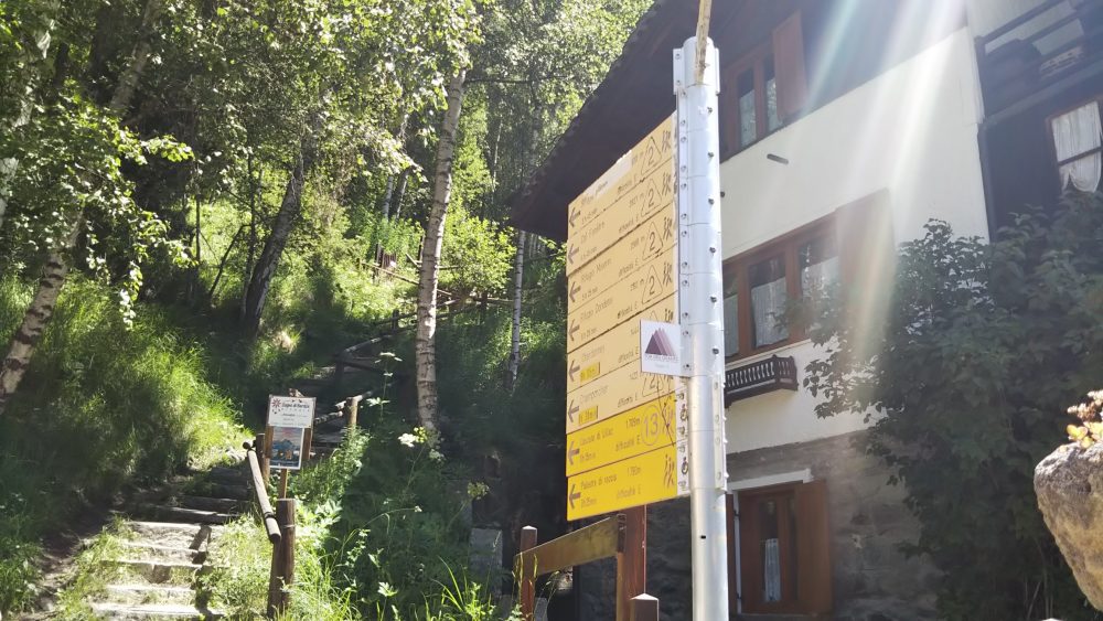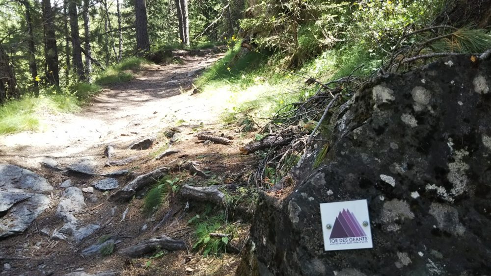 そしてトレイルには「TOR」の文字や、道標にTORのロゴの金属パネル、岩にはアオスタ周を1周するトレイルの目印が三角マークで書いてあります。