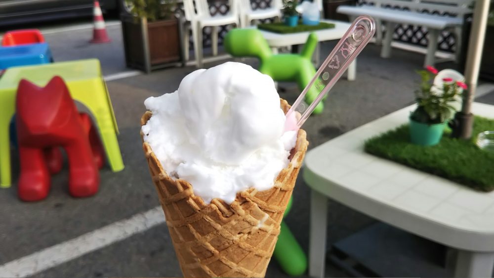 今日の宿は2km先のポン=サン=マルタンなのでそのままコースを進み、トレイルからロードに降りたところにジェラート屋さん。
