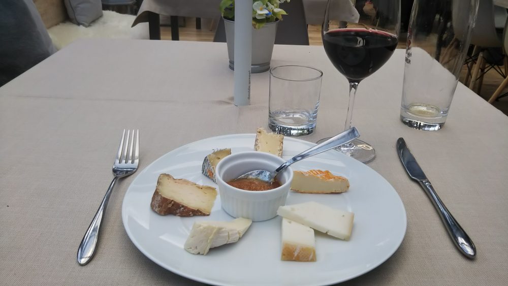 そして追加オーダーでチーズの盛り合わせ、これはスゴすぎ、チーズ勢揃い。もちろん赤ワイン。