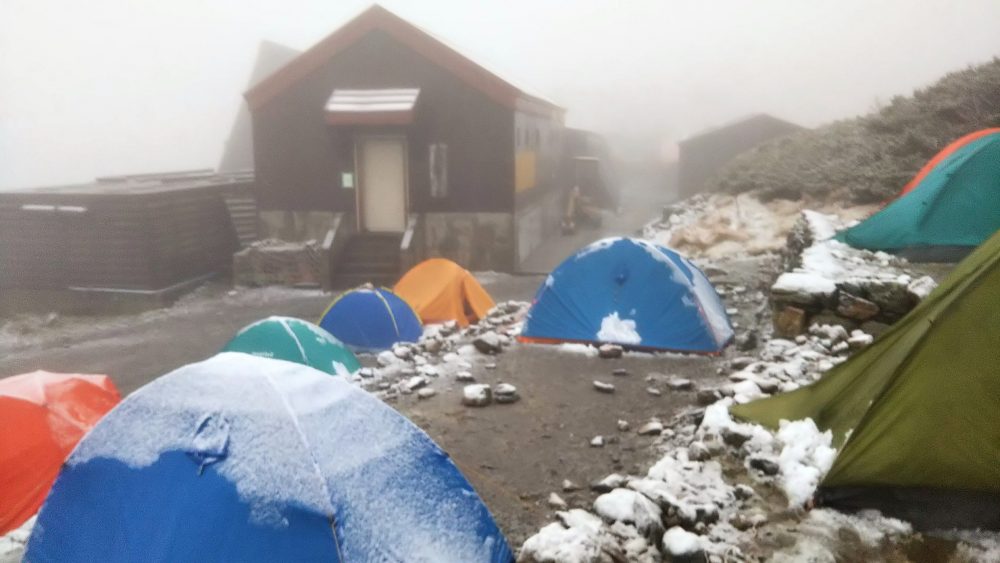 シェルターを撤収しようと外に出るとテント場は雪がうっすら。