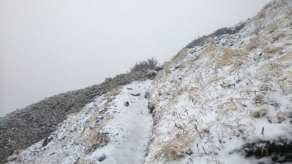 北岳山頂へのトレイルは積雪2cm。チェーンスパイク無しで問題無しのギリギリのライン。