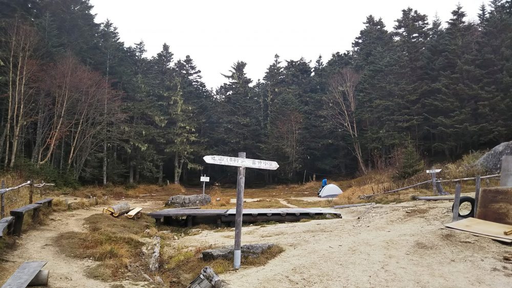 南御室小屋には2時間弱、既に紅葉は終わっていてテント場は冬の装い。